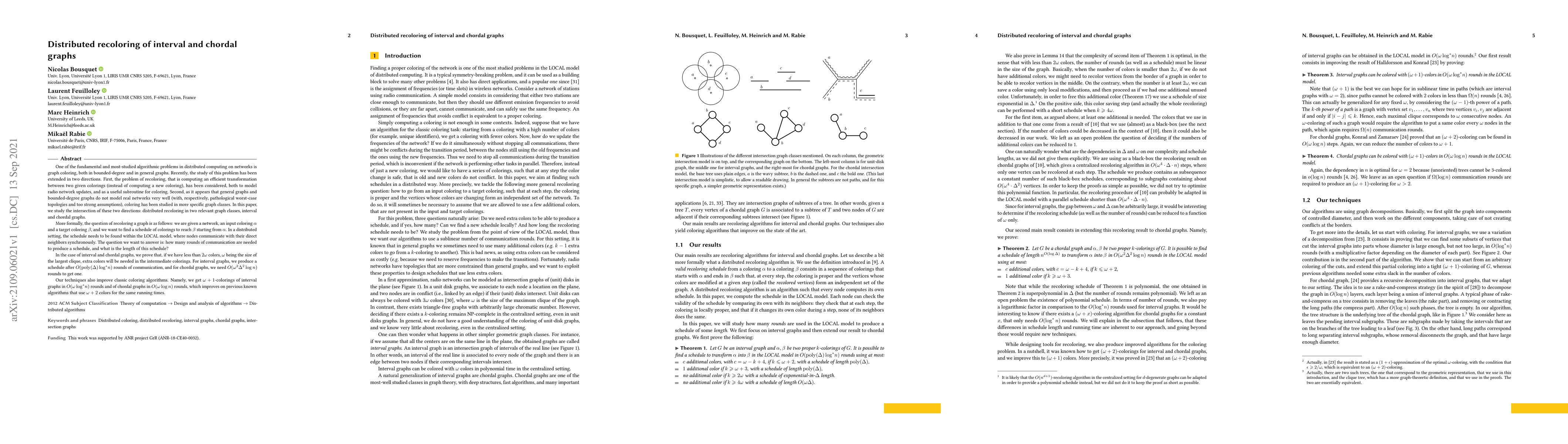 This paper investigates the distributed recoloring problem in interval and chordal graphs, focusing on efficient transformations between two given colorings to model network updates and as a subroutine for coloring, while considering these specific graph classes for better real-world network modeling.
