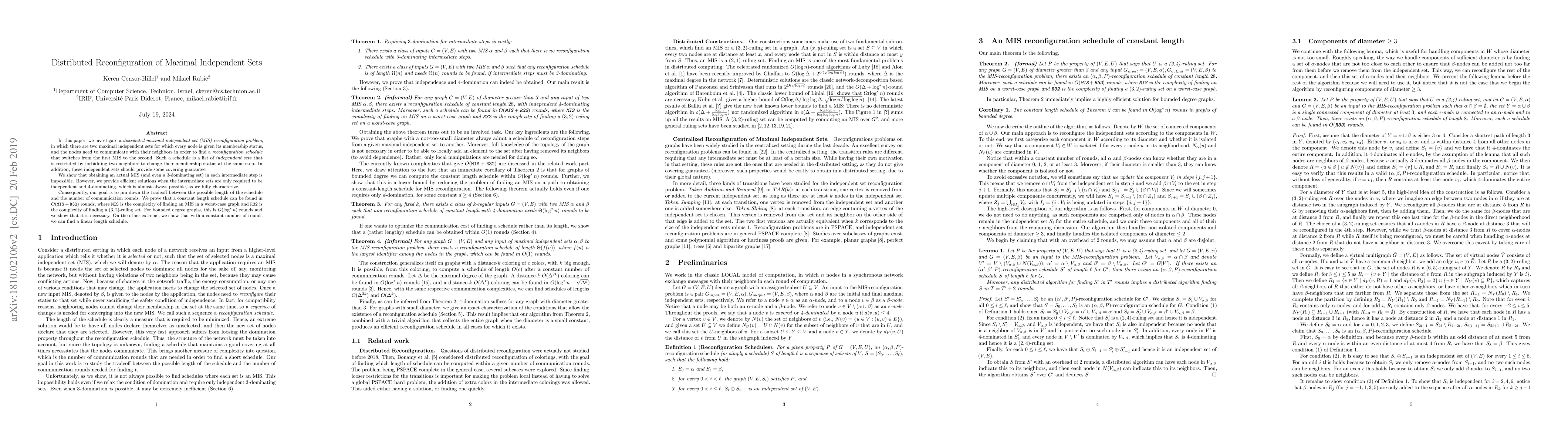 This paper explores the distributed reconfiguration of maximal independent sets (MIS) between two given MIS configurations, focusing on finding a feasible reconfiguration schedule while maintaining independence and domination properties. The authors demonstrate that maintaining strict MIS properties in intermediate steps is infeasible, but they provide efficient solutions for schedules where intermediate sets are merely independent and 4-dominating. They characterize the tradeoff between schedule length and communication rounds, proving a constant-length schedule in $O(\texttt{MIS}+\texttt{R32})$ rounds.