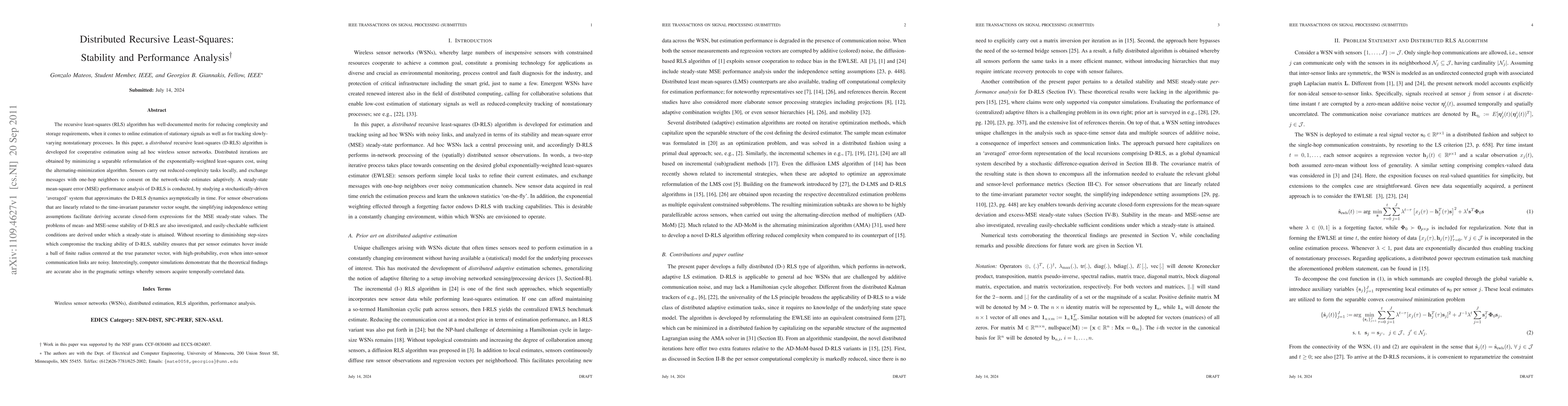 This paper develops a distributed recursive least-squares (D-RLS) algorithm for cooperative estimation in wireless sensor networks, analyzing its stability and performance. It derives sufficient conditions for mean- and MSE-sense stability without diminishing step-sizes, ensuring adaptive, accurate network-wide estimates even under noisy communication.
