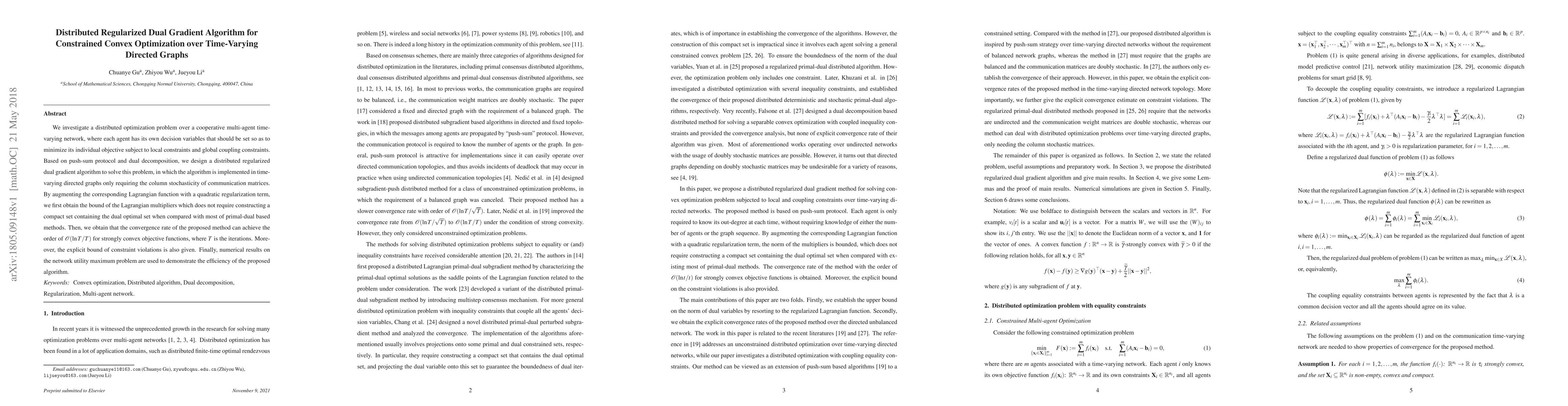 This paper proposes a distributed regularized dual gradient algorithm for solving constrained convex optimization problems over time-varying directed graphs. The algorithm achieves convergence rates of $\mathcal{O}(\ln T/T)$ for strongly convex objectives and demonstrates efficiency through numerical results in network utility maximization.