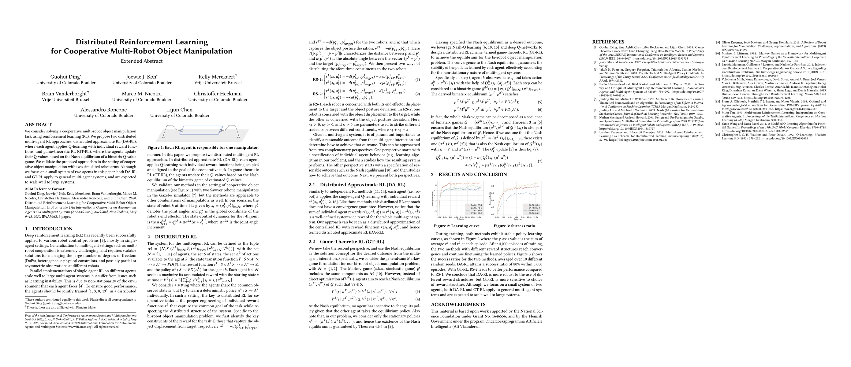 This paper proposes two distributed multi-agent reinforcement learning approaches for cooperative multi-robot object manipulation: distributed approximate RL (DA-RL) and game-theoretic RL (GT-RL). The approaches are validated in a simulated environment with two robot arms, demonstrating potential scalability to larger systems.