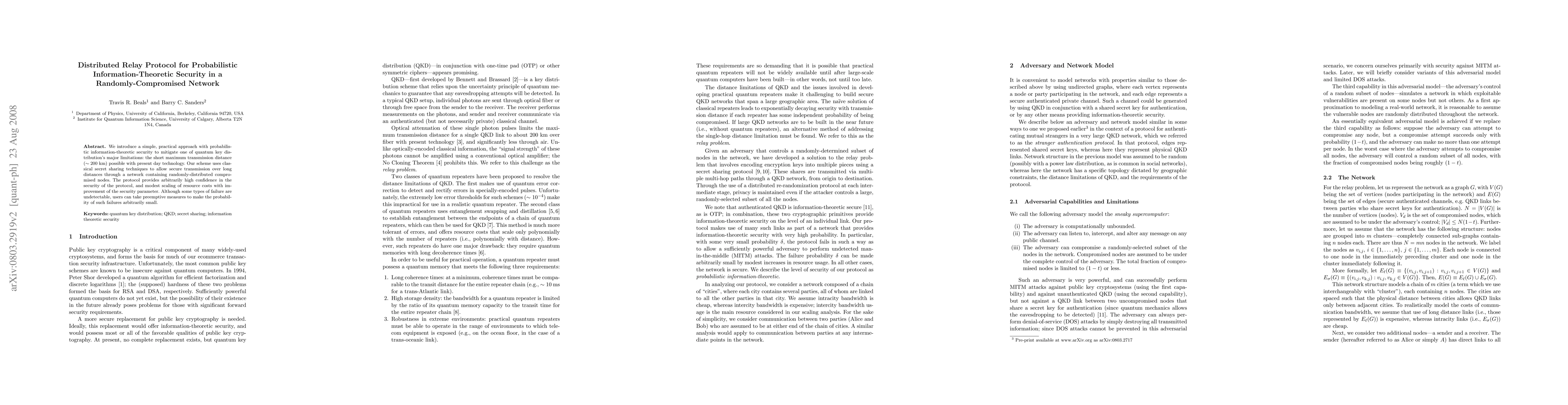 The paper presents a distributed relay protocol combining classical secret sharing and information-theoretic security to enable secure long-distance communication in networks with randomly-compromised nodes.