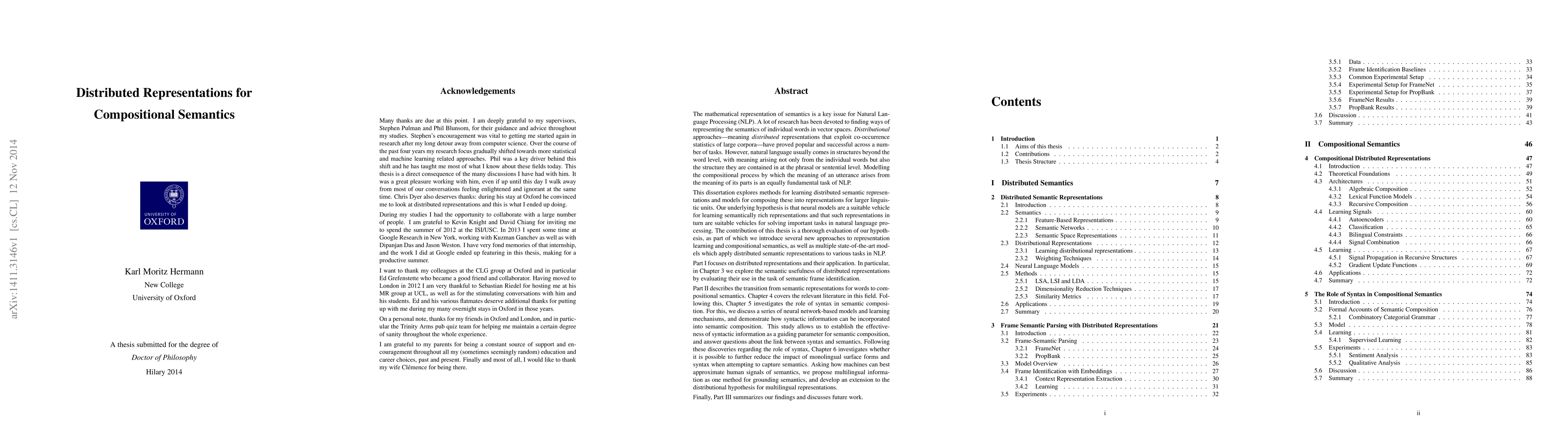 This paper investigates methods for learning distributed semantic representations and models for composing them into representations for larger linguistic units, proposing neural models as suitable vehicles for achieving semantically rich representations to enhance NLP tasks. The study introduces new approaches and evaluates their effectiveness in various NLP applications.