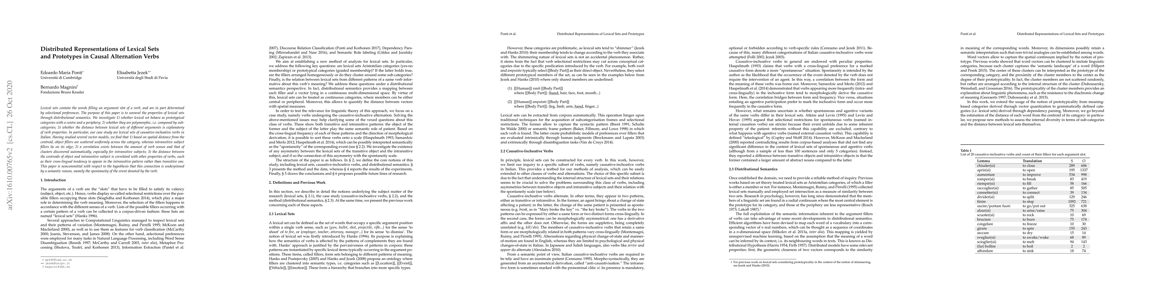 This paper explores the properties of lexical sets in causative-inchoative verbs using distributional semantics, finding that object fillers form a central category while intransitive subject fillers lie on the periphery. The study also reveals a correlation between verb senses and clusters, and the distance between object and subject sets correlates with verb properties like cross-lingual usage patterns.