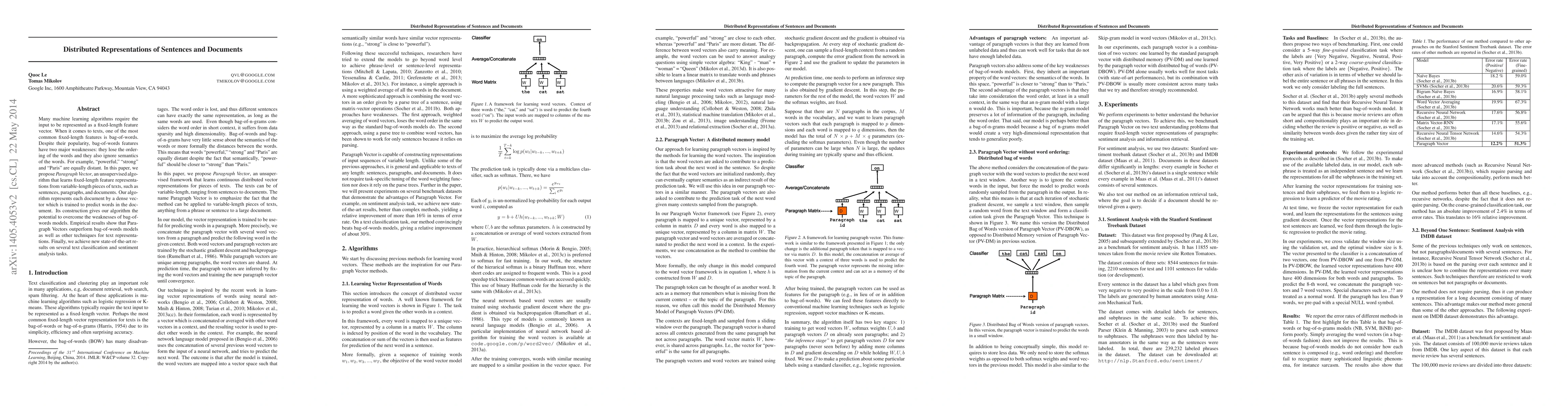 Many machine learning algorithms require the input to be represented as a fixed-length feature vector. When it comes to texts, one of the most common fixed-length features is bag-of-words. Despite their popularity, bag-of-words features have two major weaknesses: they lose the ordering of the words and they also ignore semantics of the words. For example, "powerful," "strong" and "Paris" are equally distant. In this paper, we propose Paragraph Vector, an unsupervised algorithm that learns fixed-length feature representations from variable-length pieces of texts, such as sentences, paragraphs, and documents. Our algorithm represents each document by a dense vector which is trained to predict words in the document. Its construction gives our algorithm the potential to overcome the weaknesses of bag-of-words models. Empirical results show that Paragraph Vectors outperform bag-of-words models as well as other techniques for text representations. Finally, we achieve new state-of-the-art results on several text classification and sentiment analysis tasks.