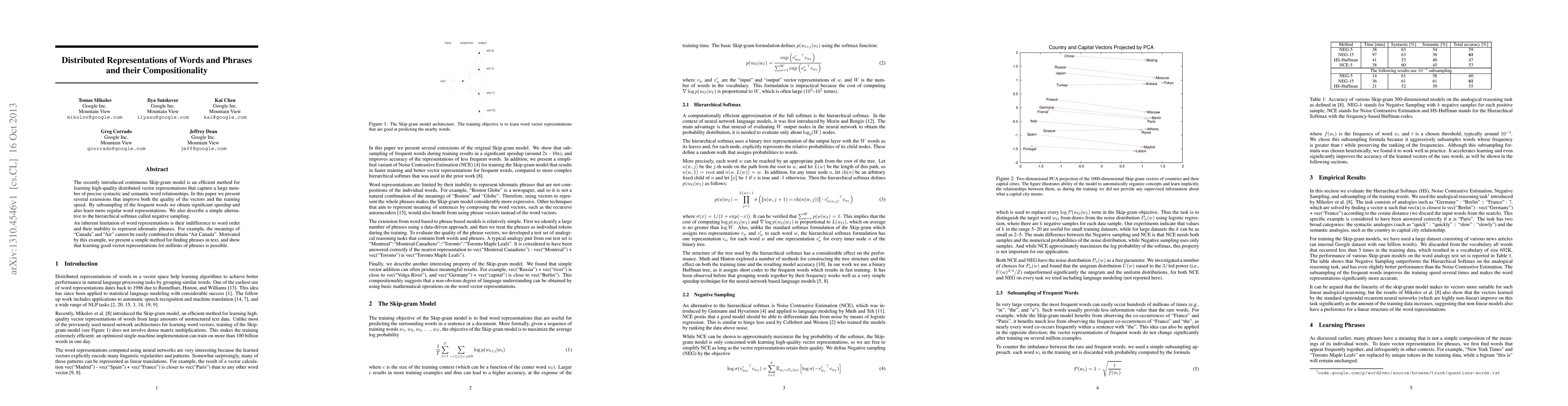 The recently introduced continuous Skip-gram model is an efficient method for learning high-quality distributed vector representations that capture a large number of precise syntactic and semantic word relationships. In this paper we present several extensions that improve both the quality of the vectors and the training speed. By subsampling of the frequent words we obtain significant speedup and also learn more regular word representations. We also describe a simple alternative to the hierarchical softmax called negative sampling. An inherent limitation of word representations is their indifference to word order and their inability to represent idiomatic phrases. For example, the meanings of "Canada" and "Air" cannot be easily combined to obtain "Air Canada". Motivated by this example, we present a simple method for finding phrases in text, and show that learning good vector representations for millions of phrases is possible.