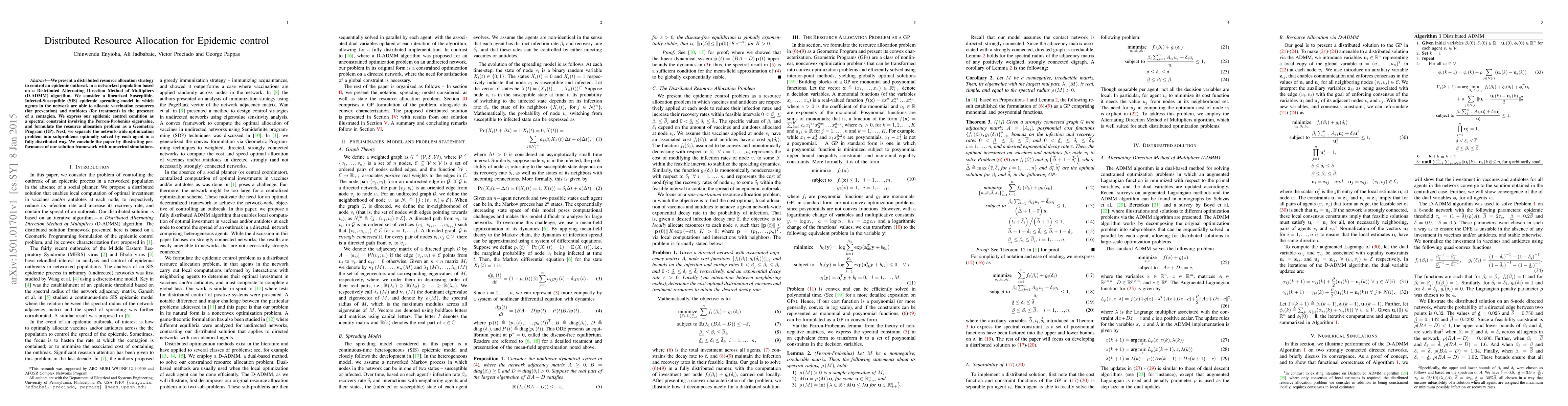 This paper proposes a distributed resource allocation strategy using a D-ADMM algorithm for epidemic control in a networked population, employing a linearized SIS model and formulating the resource allocation as a Geometric Program. Numerical simulations demonstrate the effectiveness of the proposed distributed optimization approach.