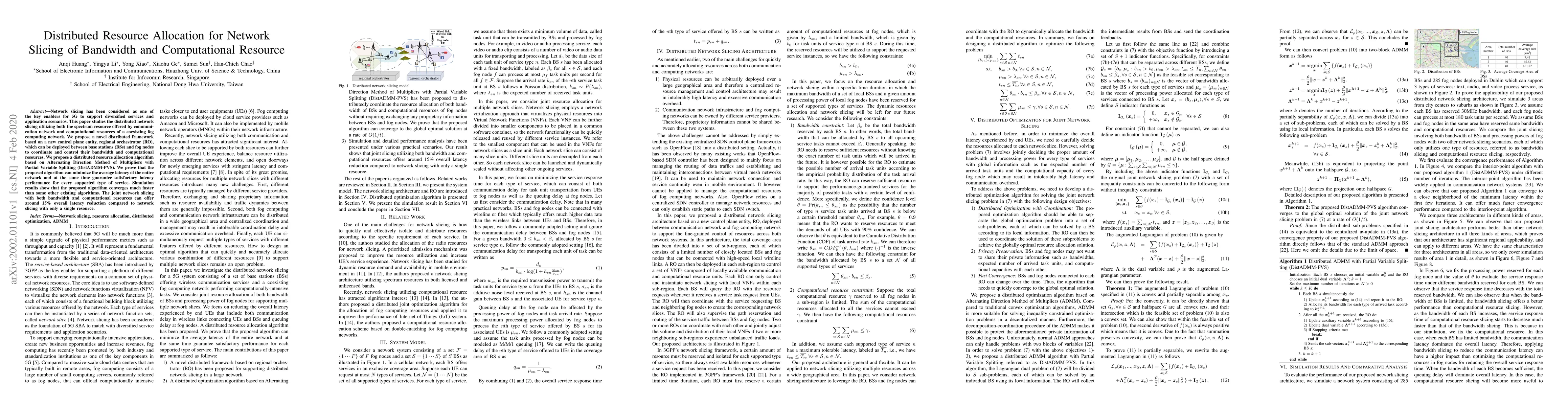 Network slicing has been considered as one of the key enablers for 5G to support diversified services and application scenarios. This paper studies the distributed network slicing utilizing both the spectrum resource offered by communication network and computational resources of a coexisting fog computing network. We propose a novel distributed framework based on a new control plane entity, regional orchestrator (RO), which can be deployed between base stations (BSs) and fog nodes to coordinate and control their bandwidth and computational resources. We propose a distributed resource allocation algorithm based on Alternating Direction Method of Multipliers with Partial Variable Splitting (DistADMM-PVS). We prove that the proposed algorithm can minimize the average latency of the entire network and at the same time guarantee satisfactory latency performance for every supported type of service. Simulation results show that the proposed algorithm converges much faster than some other existing algorithms. The joint network slicing with both bandwidth and computational resources can offer around 15% overall latency reduction compared to network slicing with only a single resource.