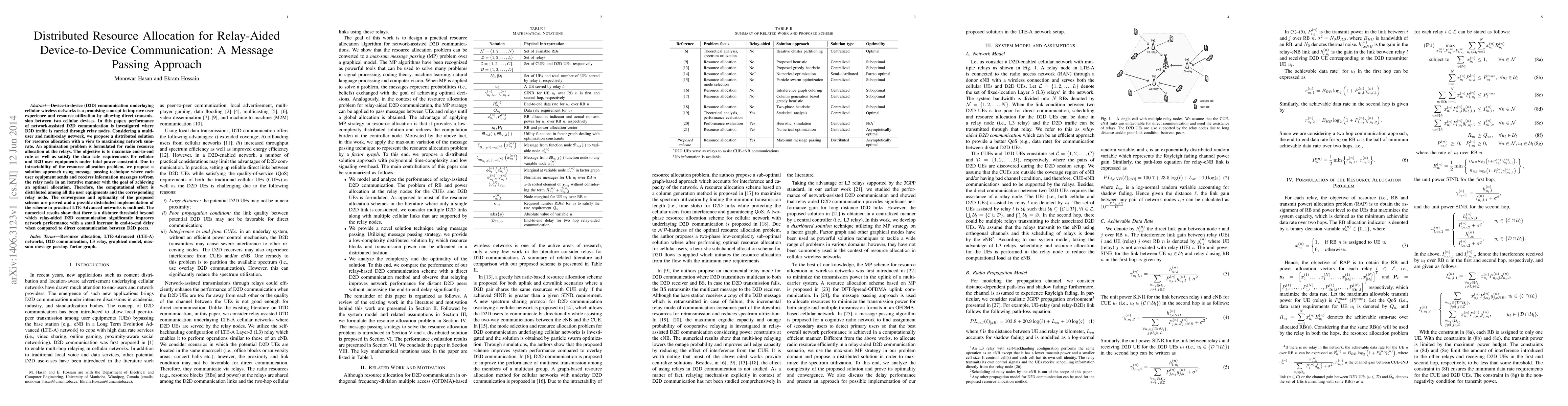 This paper proposes a distributed resource allocation method for relay-aided device-to-device (D2D) communication using a message passing technique, aiming to maximize network sum-rate while satisfying data rate requirements under power constraints. The approach distributes computational effort among user equipments and relay nodes, demonstrating improved performance beyond a certain distance threshold compared to direct D2D communication.