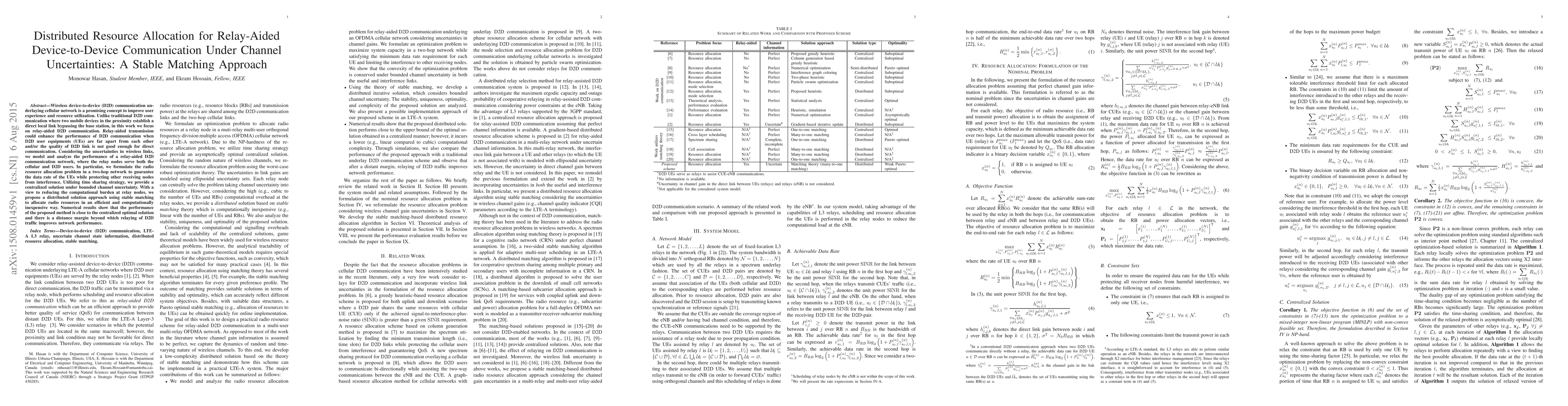 This paper proposes a stable matching approach for distributed resource allocation in relay-aided device-to-device communication networks under channel uncertainties. The method aims to efficiently allocate radio resources while ensuring data rate guarantees and interference protection, demonstrating near-optimal performance compared to centralized solutions.