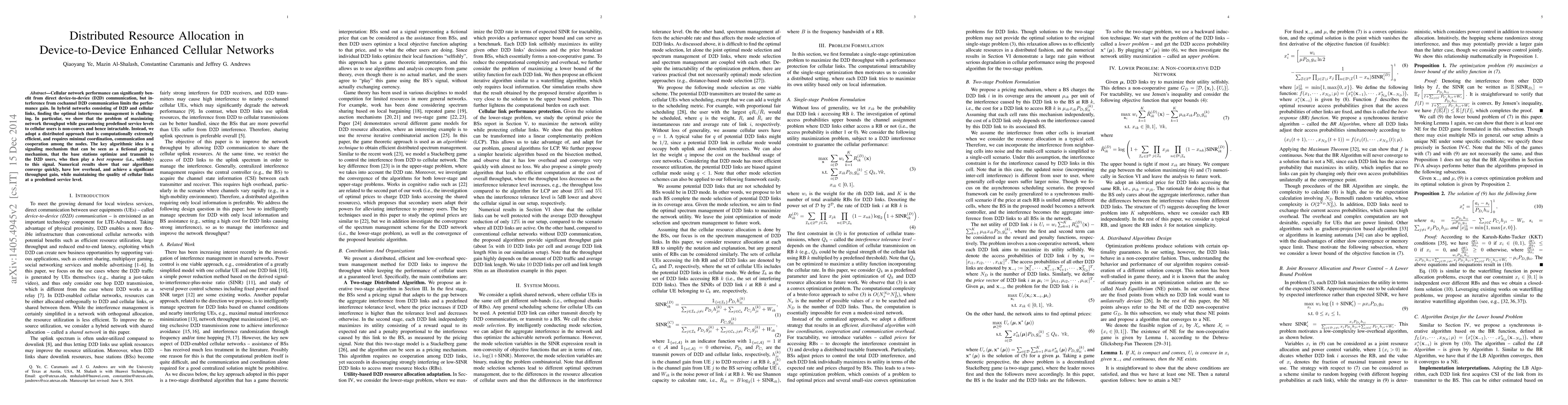 This paper proposes a distributed resource allocation method for device-to-device enhanced cellular networks, addressing the challenge of interference management. It introduces a signaling mechanism that optimizes base station signals, enabling D2D users to achieve high throughput gains while maintaining cellular service quality.