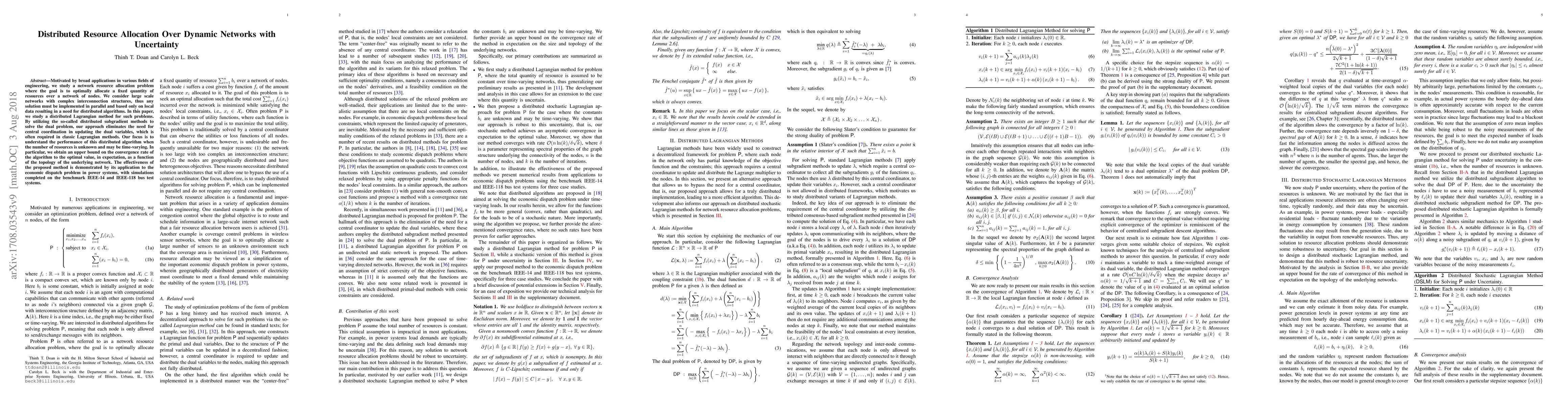 This paper explores a distributed Lagrangian method for resource allocation in large-scale dynamic networks, focusing on subgradient techniques to solve the dual problem without central coordination. It provides an upper bound on the algorithm's convergence rate and demonstrates its effectiveness through applications to economic dispatch in power systems.