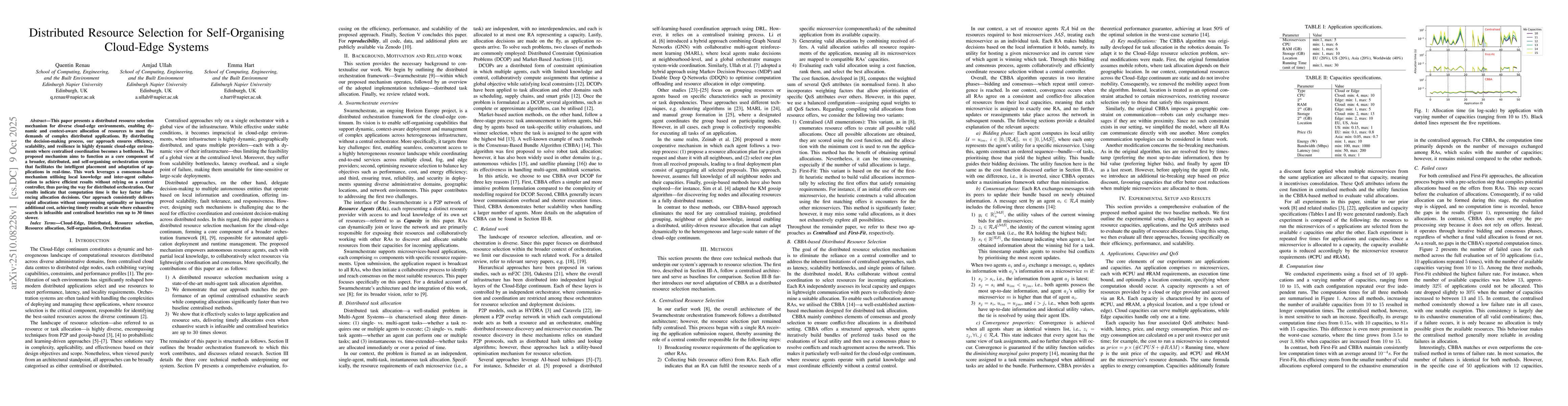This paper presents a distributed resource selection mechanism for diverse cloud-edge environments, enabling dynamic and context-aware allocation of resources to meet the demands of complex distributed applications. By distributing the decision-making process, our approach ensures efficiency, scalability, and resilience in highly dynamic cloud-edge environments where centralised coordination becomes a bottleneck. The proposed mechanism aims to function as a core component of a broader, distributed, and self-organising orchestration system that facilitates the intelligent placement and adaptation of applications in real-time. This work leverages a consensus-based mechanism utilising local knowledge and inter-agent collaboration to achieve efficient results without relying on a central controller, thus paving the way for distributed orchestration. Our results indicate that computation time is the key factor influencing allocation decisions. Our approach consistently delivers rapid allocations without compromising optimality or incurring additional cost, achieving timely results at scale where exhaustive search is infeasible and centralised heuristics run up to 30 times slower.