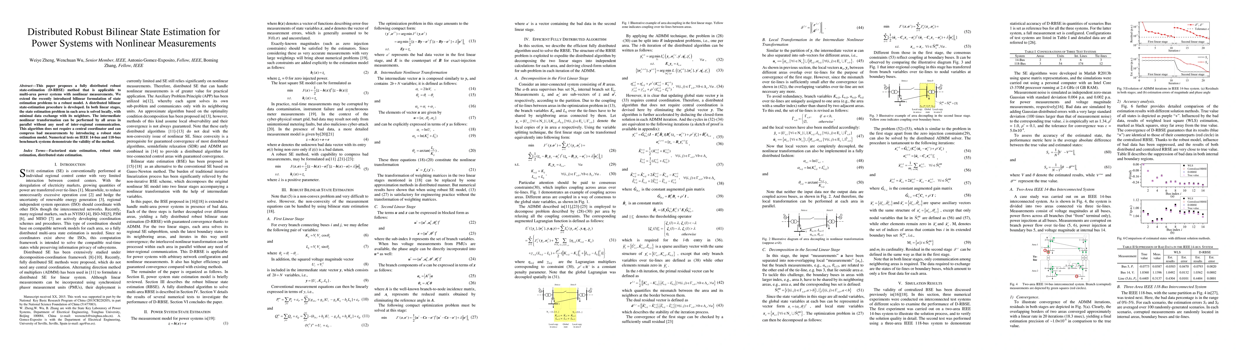 This paper introduces a distributed robust bilinear state-estimation (D-RBSE) method for multi-area power systems with nonlinear measurements, minimizing data exchange and avoiding central coordination. Numerical tests validate the method's effectiveness on IEEE 14-bus and 118-bus systems.