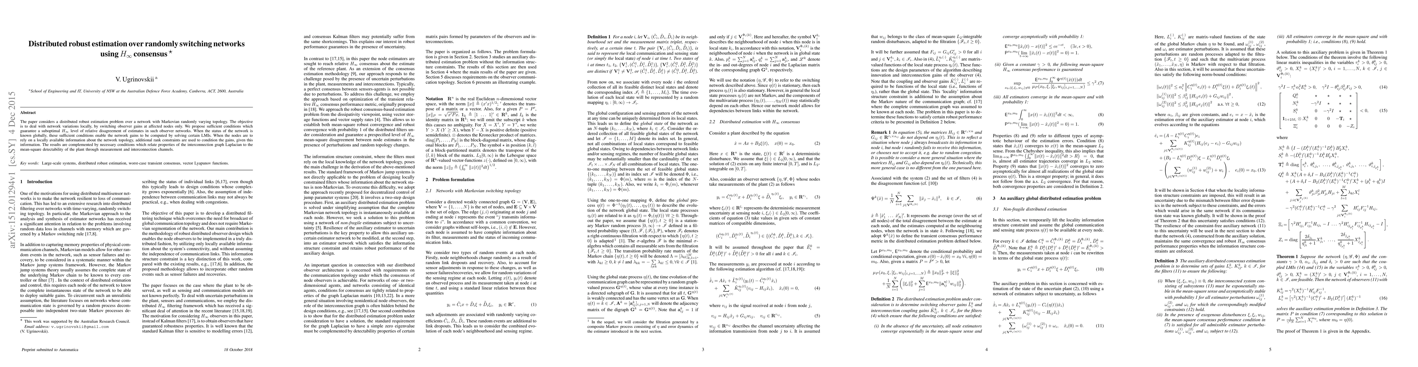 This paper proposes a method for distributed robust estimation in networks with randomly switching topology, ensuring suboptimal H∞ level of relative disagreement in estimates. It also provides necessary conditions for mean-square detectability through measurement and interconnection channels.