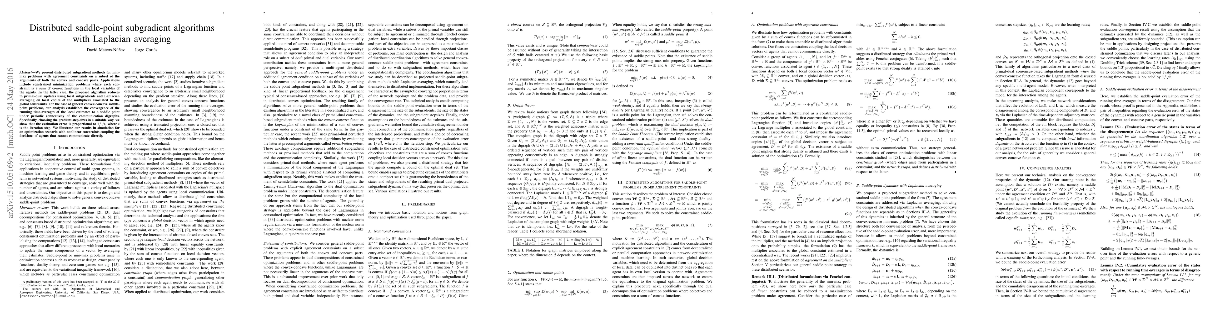This paper introduces distributed subgradient methods for solving min-max problems with agreement constraints, leveraging Laplacian averaging. The proposed algorithm converges to a saddle point under periodic connectivity, with error proportional to $1/\sqrt{t}$, and is demonstrated through simulations involving nonlinearly coupled agent decisions.