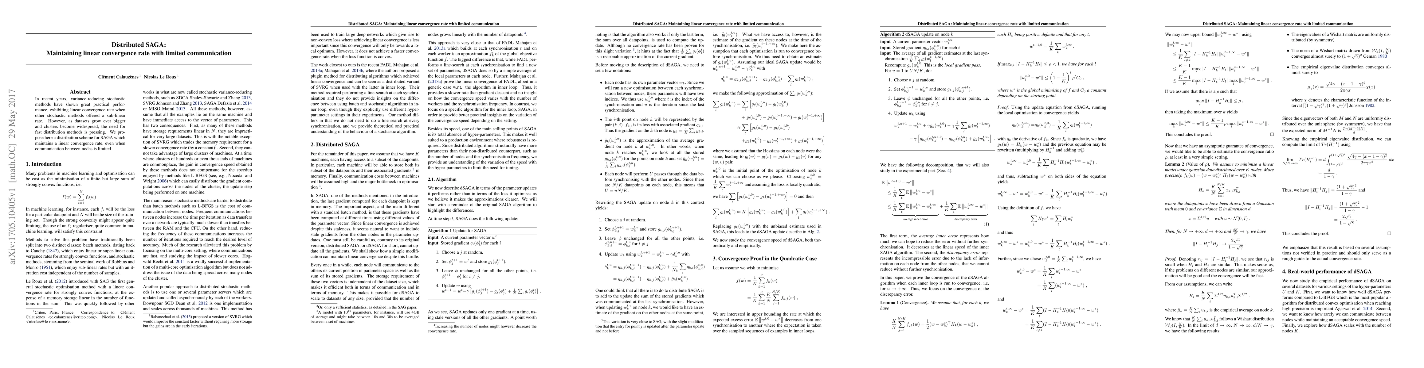 This paper proposes a distributed version of the SAGA optimization algorithm that maintains its linear convergence rate despite limited communication between nodes, addressing the scalability challenges of large datasets in distributed environments.