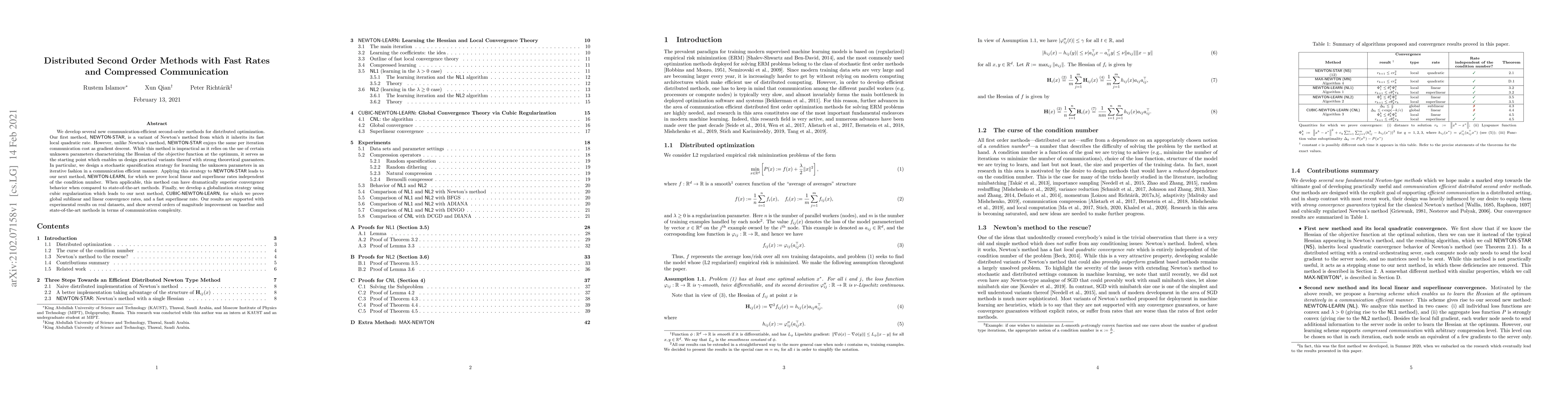 We develop several new communication-efficient second-order methods for distributed optimization. Our first method, NEWTON-STAR, is a variant of Newton's method from which it inherits its fast local quadratic rate. However, unlike Newton's method, NEWTON-STAR enjoys the same per iteration communication cost as gradient descent. While this method is impractical as it relies on the use of certain unknown parameters characterizing the Hessian of the objective function at the optimum, it serves as the starting point which enables us design practical variants thereof with strong theoretical guarantees. In particular, we design a stochastic sparsification strategy for learning the unknown parameters in an iterative fashion in a communication efficient manner. Applying this strategy to NEWTON-STAR leads to our next method, NEWTON-LEARN, for which we prove local linear and superlinear rates independent of the condition number. When applicable, this method can have dramatically superior convergence behavior when compared to state-of-the-art methods. Finally, we develop a globalization strategy using cubic regularization which leads to our next method, CUBIC-NEWTON-LEARN, for which we prove global sublinear and linear convergence rates, and a fast superlinear rate. Our results are supported with experimental results on real datasets, and show several orders of magnitude improvement on baseline and state-of-the-art methods in terms of communication complexity.