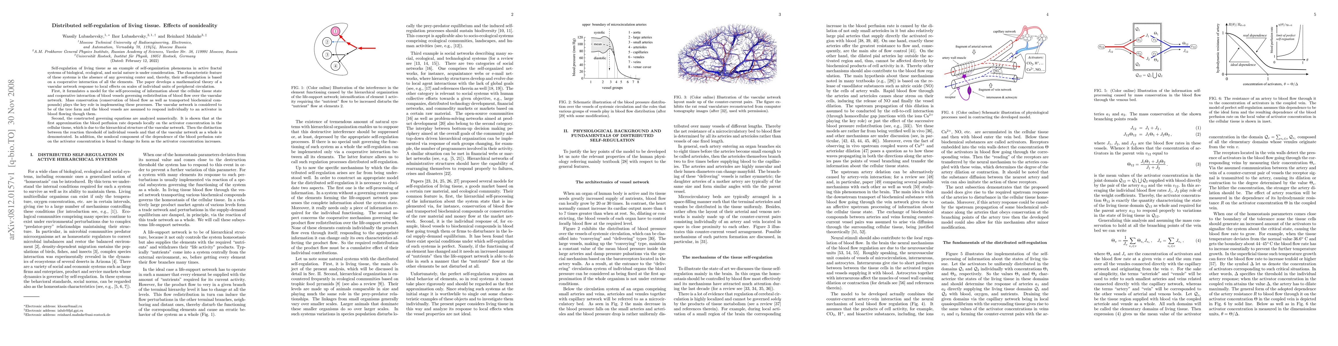 This paper explores the distributed self-regulation of living tissue in active fractal systems, focusing on vascular networks as a model. It develops a mathematical theory to describe how blood vessels cooperatively redistribute blood flow based on local activator concentrations, emphasizing the role of mass conservation and hierarchical network structure.