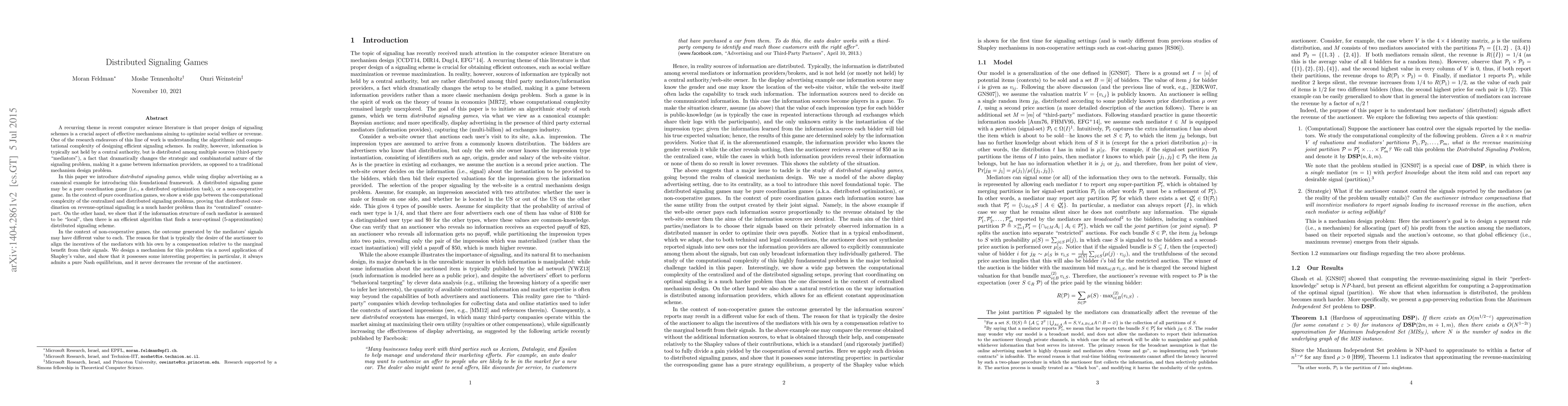 This paper introduces the concept of distributed signaling games, emphasizing the complexity of designing efficient signaling schemes when information is distributed among multiple sources. It demonstrates a significant computational gap between centralized and distributed signaling problems, while presenting an efficient algorithm for near-optimal solutions under local information assumptions. Additionally, it proposes a novel mechanism using Shapley's value for non-cooperative distributed signaling games, ensuring pure Nash equilibrium and revenue maximization for the auctioneer.