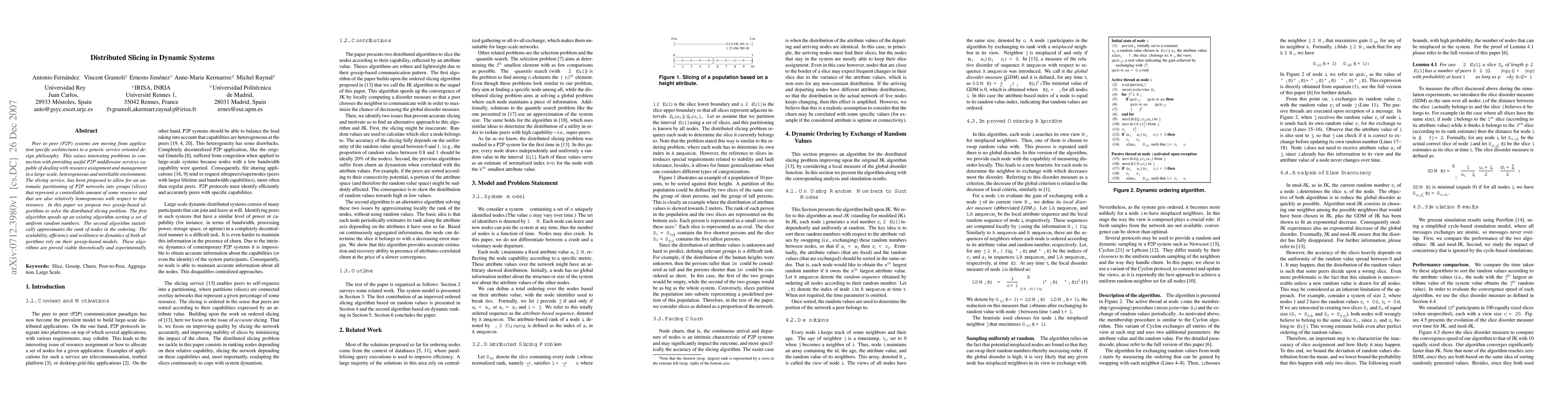 Peer to peer (P2P) systems are moving from application specific architectures to a generic service oriented design philosophy. This raises interesting problems in connection with providing useful P2P middleware services capable of dealing with resource assignment and management in a large-scale, heterogeneous and unreliable environment. The slicing service, has been proposed to allow for an automatic partitioning of P2P networks into groups (slices) that represent a controllable amount of some resource and that are also relatively homogeneous with respect to that resource. In this paper we propose two gossip-based algorithms to solve the distributed slicing problem. The first algorithm speeds up an existing algorithm sorting a set of uniform random numbers. The second algorithm statistically approximates the rank of nodes in the ordering. The scalability, efficiency and resilience to dynamics of both algorithms rely on their gossip-based models. These algorithms are proved viable theoretically and experimentally.