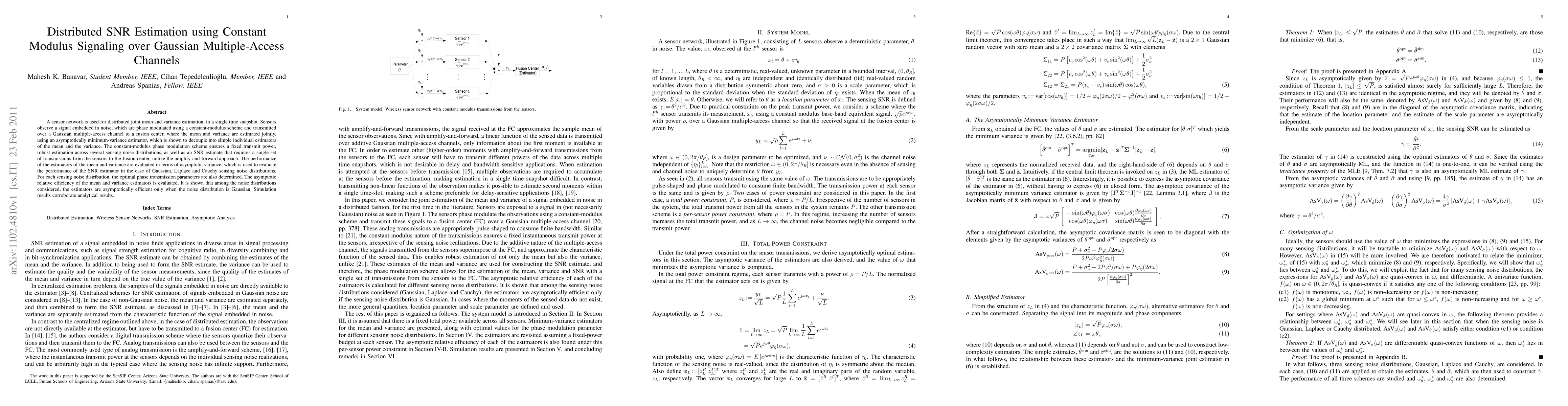 This paper proposes a distributed SNR estimation method using constant modulus signaling over Gaussian multiple-access channels, where sensors estimate the mean and variance jointly via an asymptotically minimum-variance estimator. The method ensures robust performance across various noise distributions and requires only one transmission set from sensors to the fusion center.