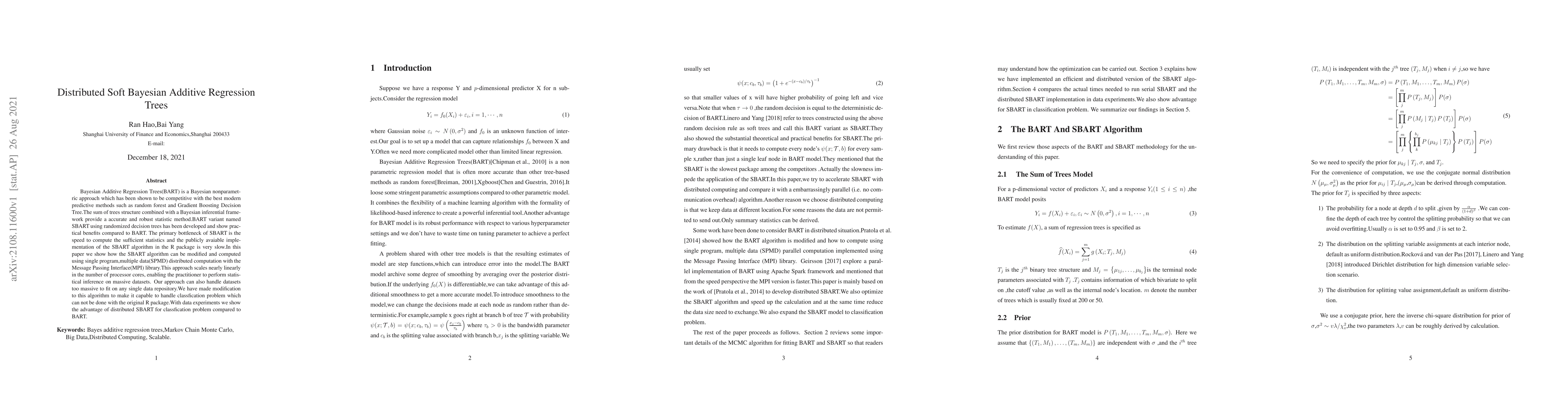 This paper presents a distributed version of the Distributed Soft Bayesian Additive Regression Trees (SBART) algorithm using the MPI library, which scales linearly with the number of processor cores, enabling faster computation and handling of massive datasets. The modified algorithm also extends SBART's capability to classification problems, demonstrating its advantages over the original BART method through data experiments.