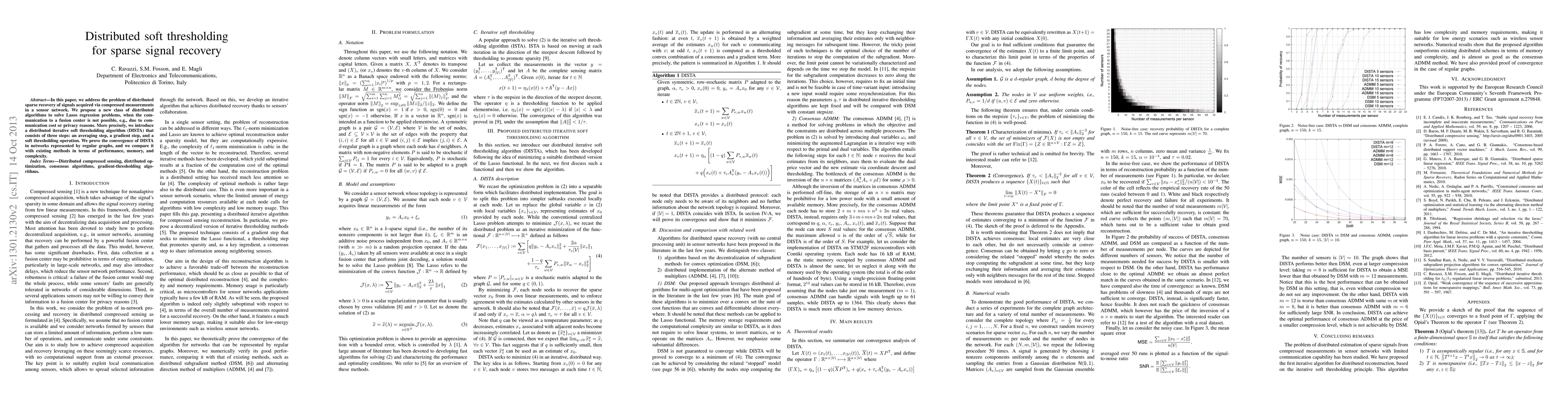 In this paper, we address the problem of distributed sparse recovery of signals acquired via compressed measurements in a sensor network. We propose a new class of distributed algorithms to solve Lasso regression problems, when the communication to a fusion center is not possible, e.g., due to communication cost or privacy reasons. More precisely, we introduce a distributed iterative soft thresholding algorithm (DISTA) that consists of three steps: an averaging step, a gradient step, and a soft thresholding operation. We prove the convergence of DISTA in networks represented by regular graphs, and we compare it with existing methods in terms of performance, memory, and complexity.