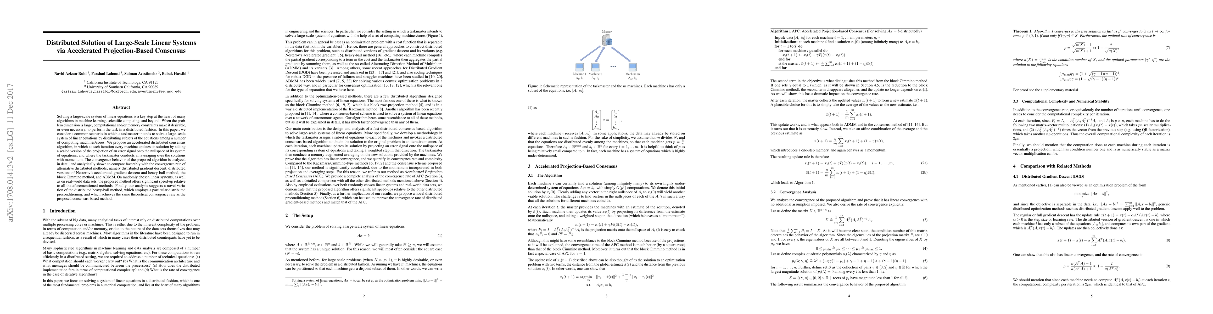 This paper proposes an accelerated distributed consensus algorithm for solving large-scale linear systems, showing it converges faster than distributed gradient descent, Nesterov's method, and ADMM, with significant speed-up on both random and real-world datasets. The method involves each machine updating its solution via projection-based consensus and the taskmaster averaging solutions with momentum.