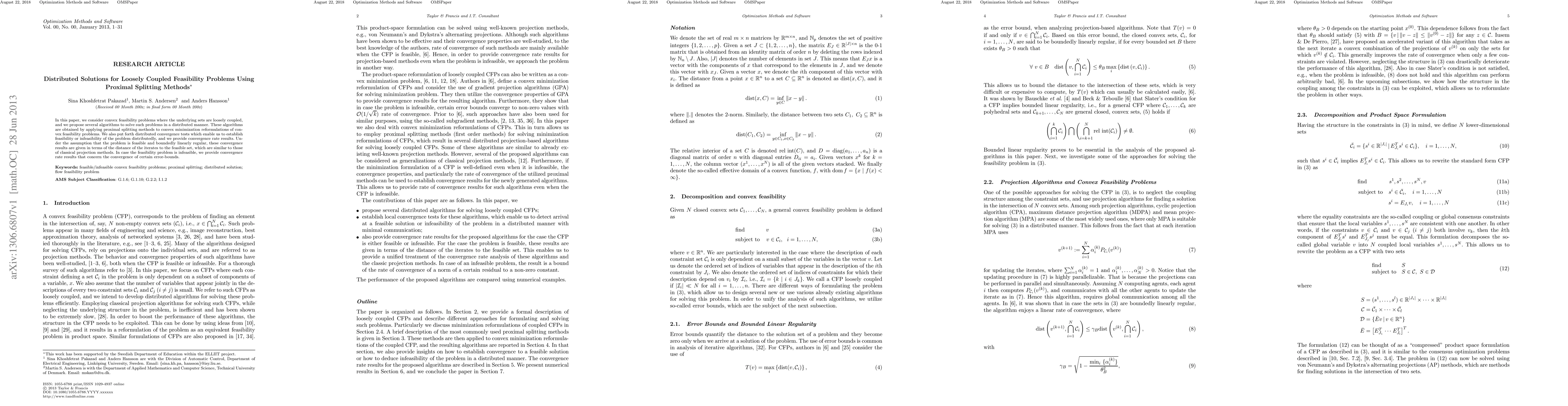 This paper proposes distributed algorithms for solving loosely coupled convex feasibility problems using proximal splitting methods. It establishes distributed convergence tests and provides convergence rate results, showing performance similar to classical projection methods when the problem is feasible, and error-bound convergence when infeasible.
