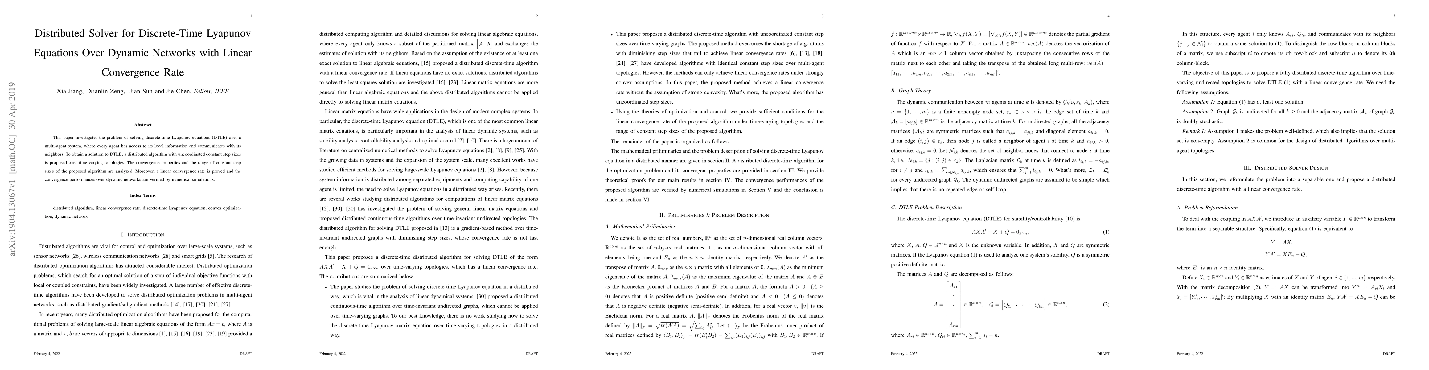 This paper proposes a distributed algorithm for solving discrete-time Lyapunov equations in multi-agent systems, demonstrating linear convergence rate and analyzing the algorithm's performance over dynamic networks through numerical simulations.