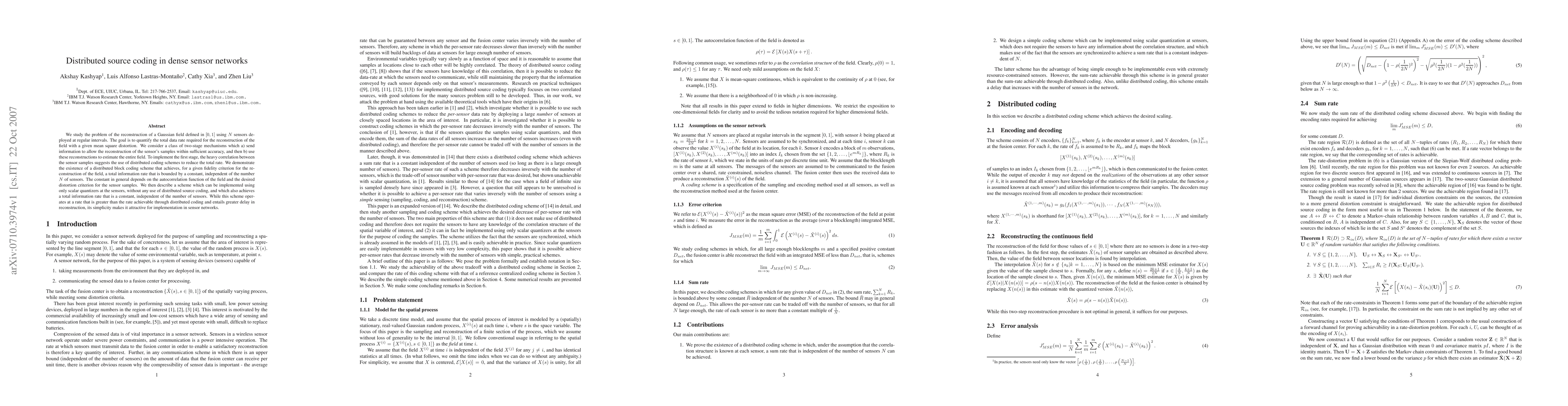 This paper investigates distributed source coding for reconstructing a Gaussian field using sensor networks, demonstrating a coding scheme that achieves a constant total data rate independent of the number of sensors. It also presents a simpler, albeit less efficient, scalar quantizer-based scheme suitable for practical implementation in dense sensor networks.