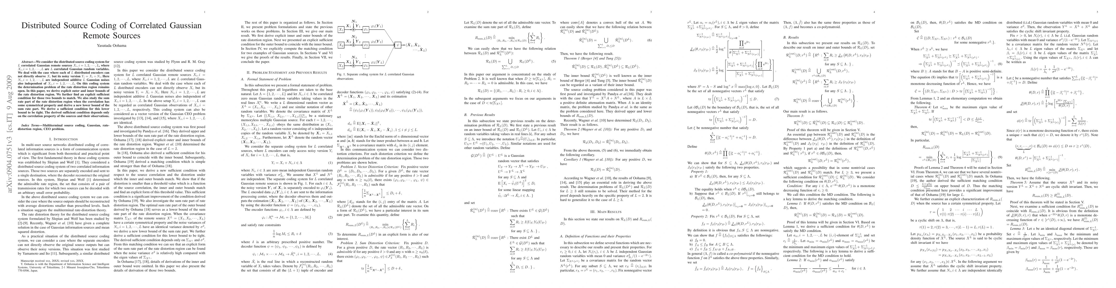 We consider the distributed source coding system for $L$ correlated Gaussian observations $Y_i, i=1,2, ..., L$. Let $X_i,i=1,2, ..., L$ be $L$ correlated Gaussian random variables and $N_i,$ $i=1,2,... L$ be independent additive Gaussian noises also independent of $X_i, i=1,2,..., L$. We consider the case where for each $i=1,2,..., L$, $Y_i$ is a noisy observation of $X_i$, that is, $Y_i=X_i+N_i$. On this coding system the determination problem of the rate distortion region remains open. In this paper, we derive explicit outer and inner bounds of the rate distortion region. We further find an explicit sufficient condition for those two to match. We also study the sum rate part of the rate distortion region when the correlation has some symmetrical property and derive a new lower bound of the sum rate part. We derive a sufficient condition for this lower bound to be tight. The derived sufficient condition depends only on the correlation property of the sources and their observations.