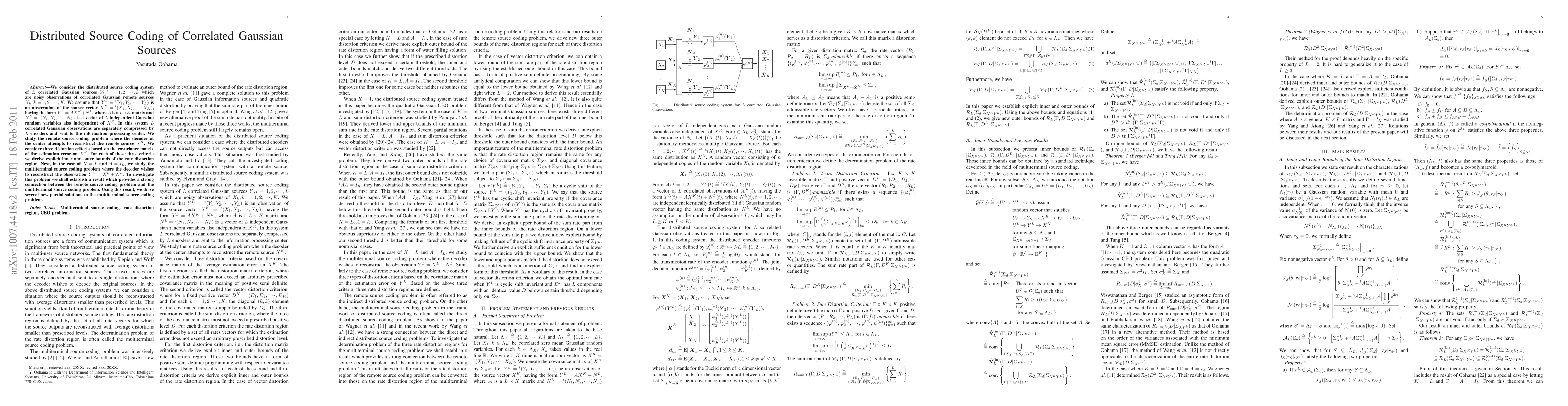 This paper investigates distributed source coding for $L$ correlated Gaussian sources observed through noisy channels. It derives inner and outer bounds for the rate distortion region under three distortion criteria and establishes a connection between remote source coding and multiterminal source coding, providing new partial solutions for the latter.