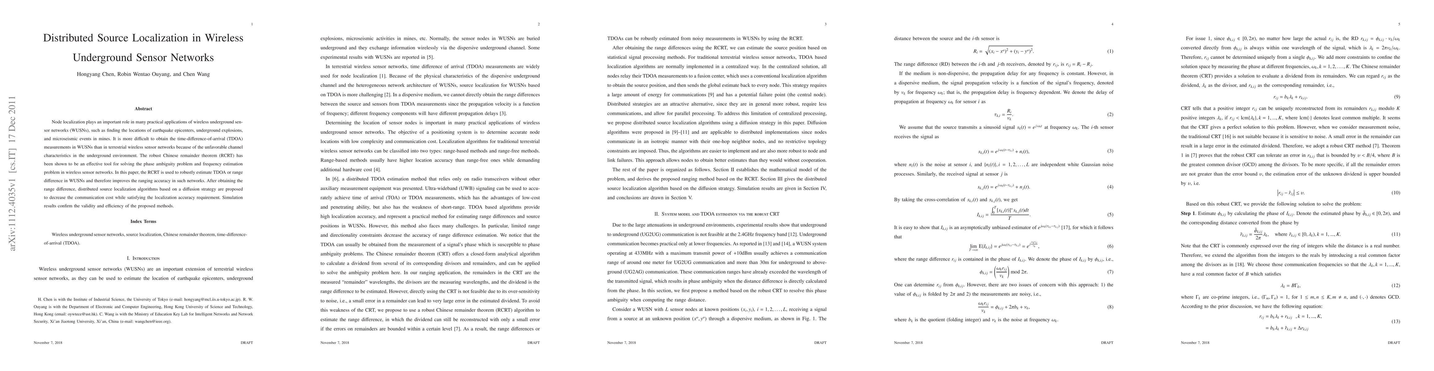 This paper proposes a method using the Robust Chinese Remainder Theorem (RCRT) to estimate time-difference-of-arrival (TDOA) in wireless underground sensor networks (WUSNs) to improve localization accuracy. It introduces distributed localization algorithms based on a diffusion strategy to reduce communication costs while maintaining localization accuracy.