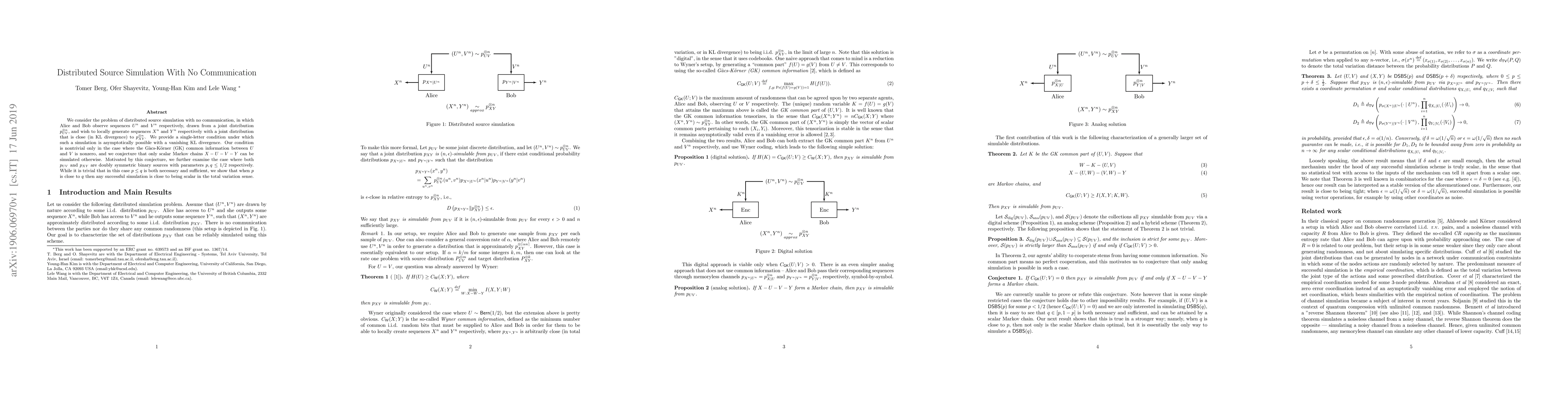 We consider the problem of distributed source simulation with no communication, in which Alice and Bob observe sequences $U^n$ and $V^n$ respectively, drawn from a joint distribution $p_{UV}^{\otimes n}$, and wish to locally generate sequences $X^n$ and $Y^n$ respectively with a joint distribution that is close (in KL divergence) to $p_{XY}^{\otimes n}$. We provide a single-letter condition under which such a simulation is asymptotically possible with a vanishing KL divergence. Our condition is nontrivial only in the case where the G\`acs-K\"orner (GK) common information between $U$ and $V$ is nonzero, and we conjecture that only scalar Markov chains $X-U-V-Y$ can be simulated otherwise. Motivated by this conjecture, we further examine the case where both $p_{UV}$ and $p_{XY}$ are doubly symmetric binary sources with parameters $p,q\leq 1/2$ respectively. While it is trivial that in this case $p\leq q$ is both necessary and sufficient, we show that when $p$ is close to $q$ then any successful simulation is close to being scalar in the total variation sense.