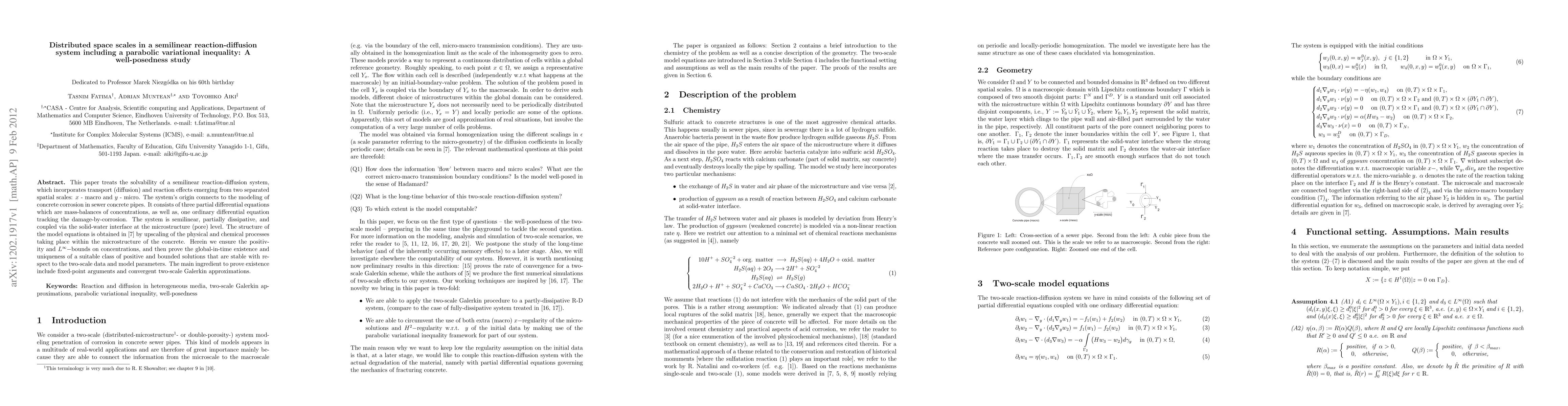 This paper investigates the well-posedness of a semilinear reaction-diffusion system modeling concrete corrosion, incorporating two spatial scales and ensuring positivity and boundedness of solutions. It proves global-in-time existence and uniqueness of stable solutions using fixed-point arguments and two-scale Galerkin approximations.