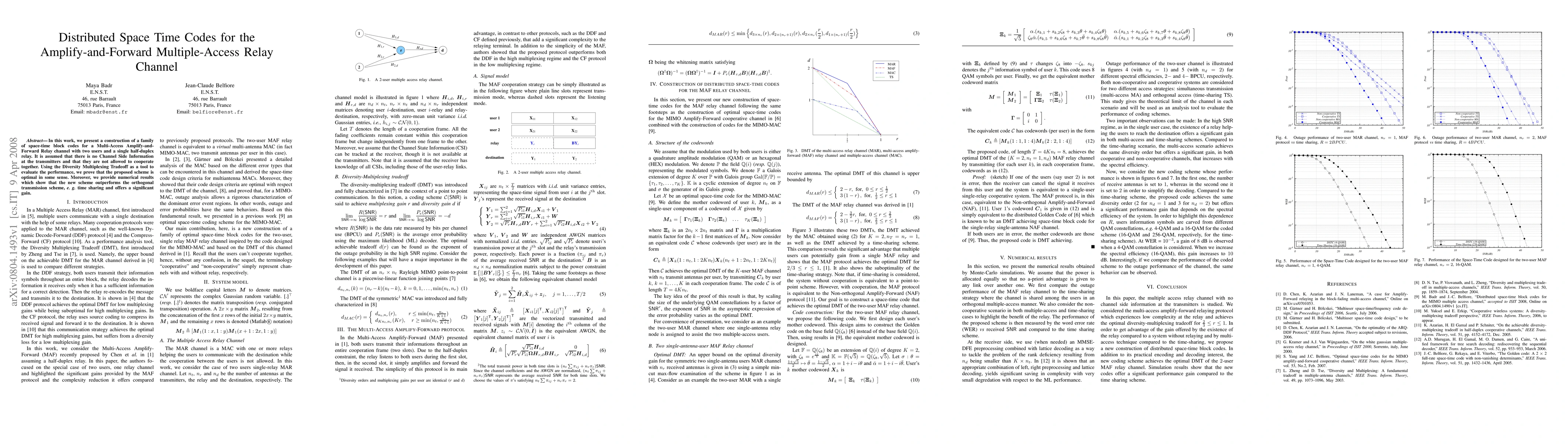 This paper constructs distributed space-time block codes for a two-user amplify-and-forward relay channel, demonstrating optimal performance via the Diversity Multiplexing Tradeoff. The proposed scheme outperforms orthogonal transmission methods, showing significant gains.