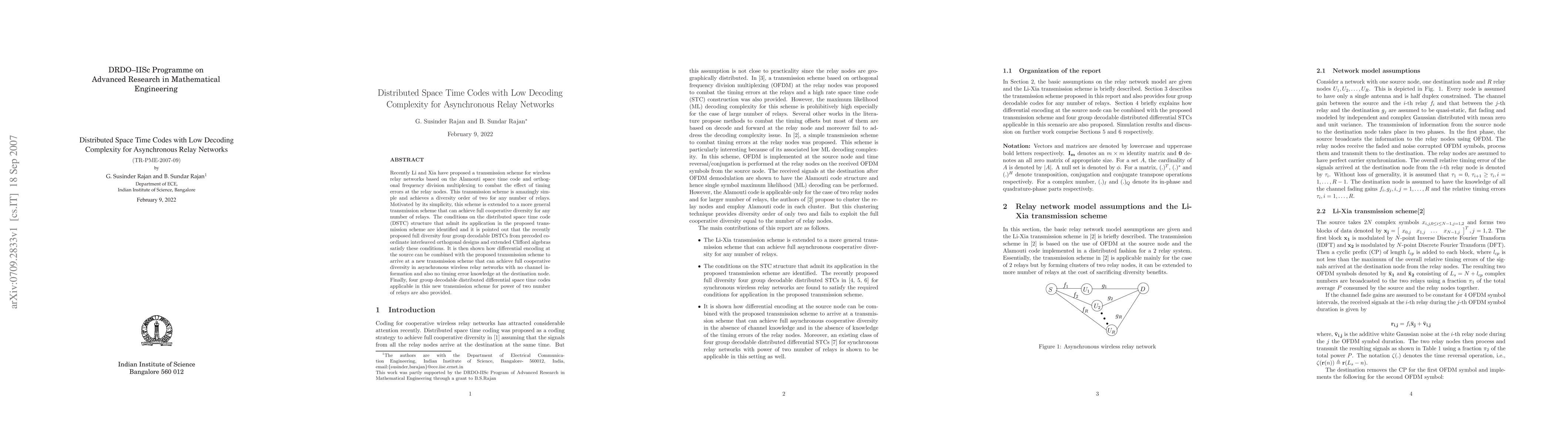 Recently Li and Xia have proposed a transmission scheme for wireless relay networks based on the Alamouti space time code and orthogonal frequency division multiplexing to combat the effect of timing errors at the relay nodes. This transmission scheme is amazingly simple and achieves a diversity order of two for any number of relays. Motivated by its simplicity, this scheme is extended to a more general transmission scheme that can achieve full cooperative diversity for any number of relays. The conditions on the distributed space time code (DSTC) structure that admit its application in the proposed transmission scheme are identified and it is pointed out that the recently proposed full diversity four group decodable DSTCs from precoded co-ordinate interleaved orthogonal designs and extended Clifford algebras satisfy these conditions. It is then shown how differential encoding at the source can be combined with the proposed transmission scheme to arrive at a new transmission scheme that can achieve full cooperative diversity in asynchronous wireless relay networks with no channel information and also no timing error knowledge at the destination node. Finally, four group decodable distributed differential space time codes applicable in this new transmission scheme for power of two number of relays are also provided.
