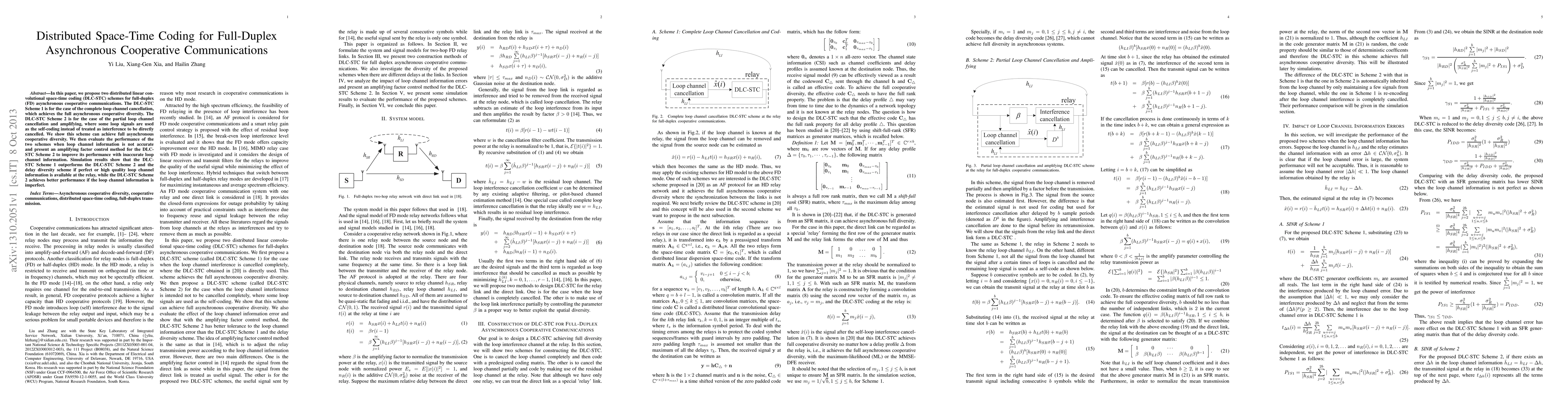 This paper proposes two distributed linear convolutional space-time coding schemes for full-duplex asynchronous cooperative communications, achieving full asynchronous cooperative diversity. Scheme 1 excels with accurate loop channel information, while Scheme 2, with an amplifying factor control method, performs better under imperfect conditions.