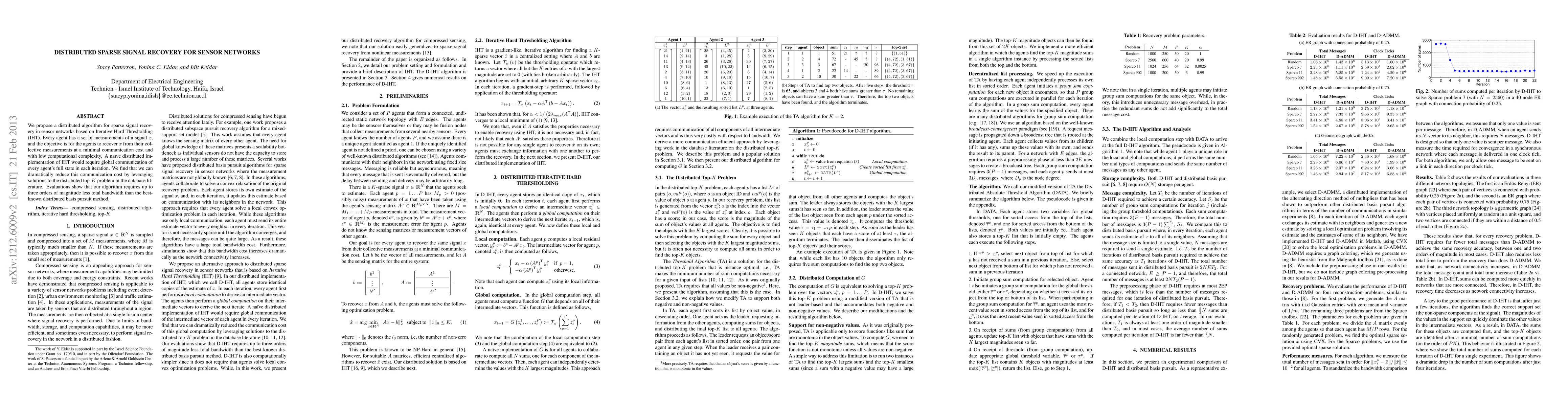 This paper proposes a distributed sparse signal recovery algorithm using Iterative Hard Thresholding (IHT) for sensor networks, significantly reducing communication costs by leveraging distributed top-K solutions, leading to up to three orders of magnitude less total bandwidth usage compared to existing methods.