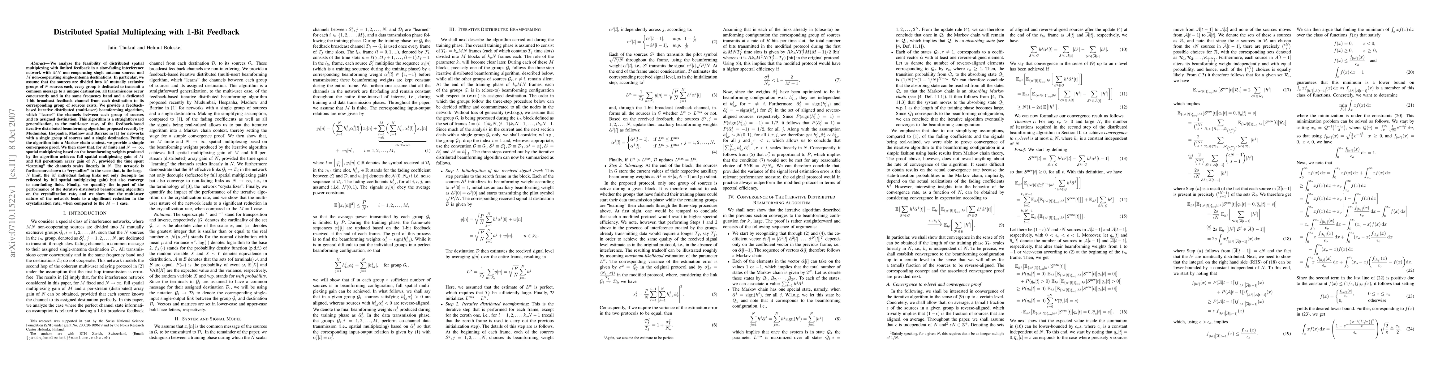 We analyze a slow-fading interference network with MN non-cooperating single-antenna sources and M non-cooperating single-antenna destinations. In particular, we assume that the sources are divided into M mutually exclusive groups of N sources each, every group is dedicated to transmit a common message to a unique destination, all transmissions occur concurrently and in the same frequency band and a dedicated 1-bit broadcast feedback channel from each destination to its corresponding group of sources exists. We provide a feedback-based iterative distributed (multi-user) beamforming algorithm, which "learns" the channels between each group of sources and its assigned destination. This algorithm is a straightforward generalization, to the multi-user case, of the feedback-based iterative distributed beamforming algorithm proposed recently by Mudumbai et al., in IEEE Trans. Inf. Th. (submitted) for networks with a single group of sources and a single destination. Putting the algorithm into a Markov chain context, we provide a simple convergence proof. We then show that, for M finite and N approaching infinity, spatial multiplexing based on the beamforming weights produced by the algorithm achieves full spatial multiplexing gain of M and full per-stream array gain of N, provided the time spent "learning'' the channels scales linearly in N. The network is furthermore shown to "crystallize''. Finally, we characterize the corresponding crystallization rate.