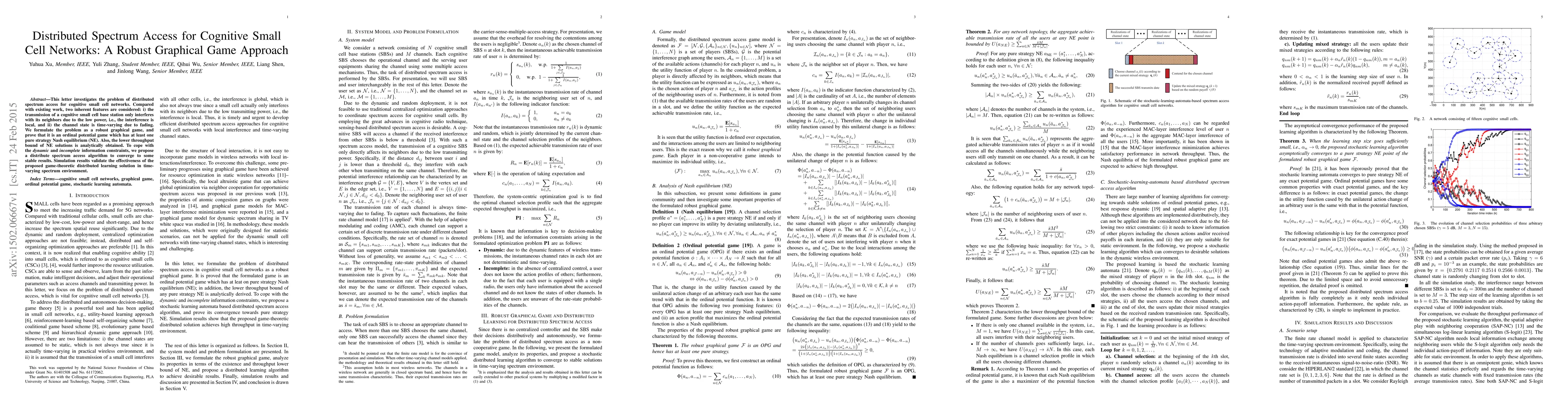 This paper proposes a robust graphical game approach for distributed spectrum access in cognitive small cell networks, considering local interference and time-varying channels. It proves the problem as an ordinal potential game with a Nash equilibrium and analytically derives its lower throughput bound, while introducing a distributed algorithm to achieve stable results in dynamic environments.