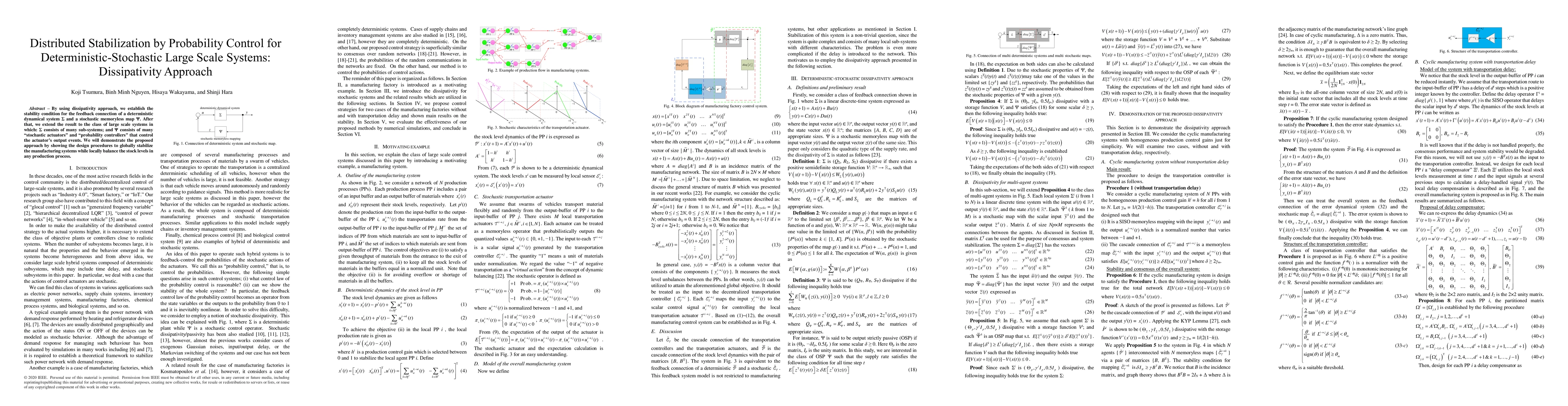 By using dissipativity approach, we establish the stability condition for the feedback connection of a deterministic dynamical system $\Sigma$ and a stochastic memoryless map $\Psi$. After that, we extend the result to the class of large scale systems in which: $\Sigma$ consists of many sub-systems; and $\Psi$ consists of many "stochastic actuators" and "probability controllers" that control the actuator's output events. We will demonstrate the proposed approach by showing the design procedures to globally stabilize the manufacturing systems while locally balance the stock levels in any production process.