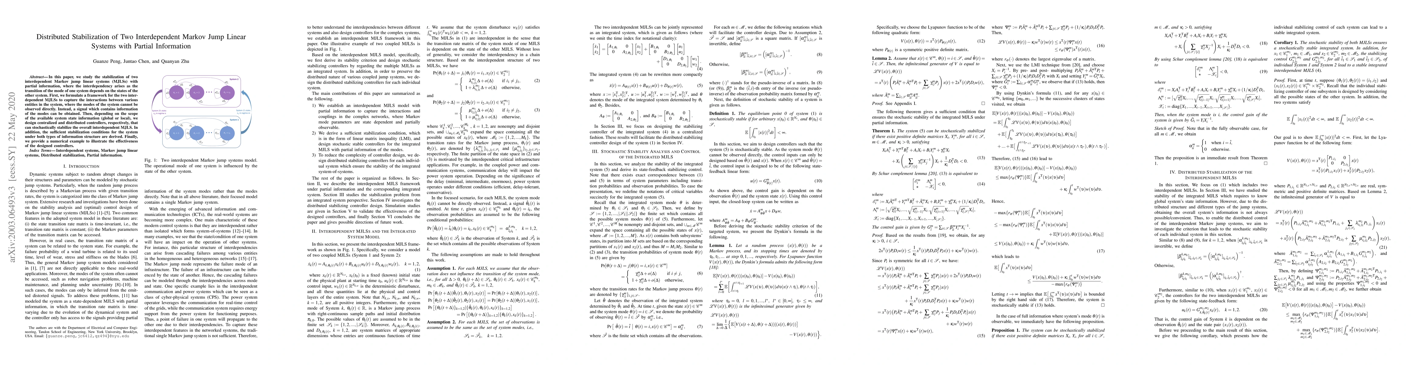 In this paper, we study the stabilization of two interdependent Markov jump linear systems (MJLSs) with partial information, where the interdependency arises as the transition of the mode of one system depends on the states of the other system. First, we formulate a framework for the two interdependent MJLSs to capture the interactions between various entities in the system, where the modes of the system cannot be observed directly. Instead, a signal which contains information of the modes can be obtained. Then, depending on the scope of the available system state information (global or local), we design centralized and distributed controllers, respectively, that can stochastically stabilize the overall interdependent MJLS. In addition, the sufficient stabilization conditions for the system under both types of information structure are derived. Finally, we provide a numerical example to illustrate the effectiveness of the designed controllers.