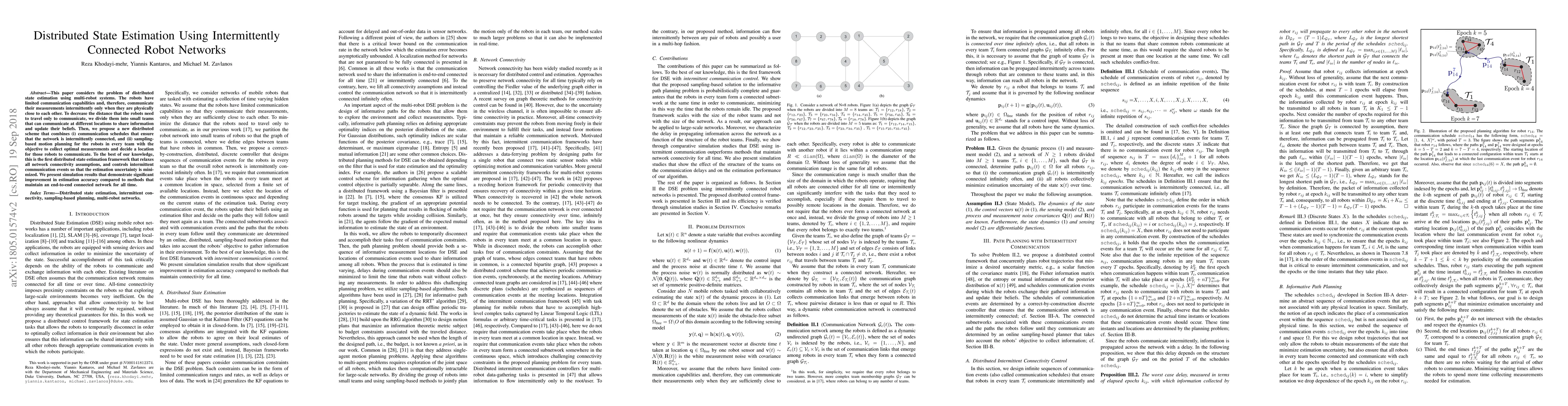 This paper introduces a distributed state estimation method for robot networks with intermittent communication, dividing robots into teams for localized information sharing. It proposes a novel scheme combining communication schedules and motion planning to minimize travel and uncertainty, demonstrating improved estimation accuracy via simulations compared to constantly connected network methods.