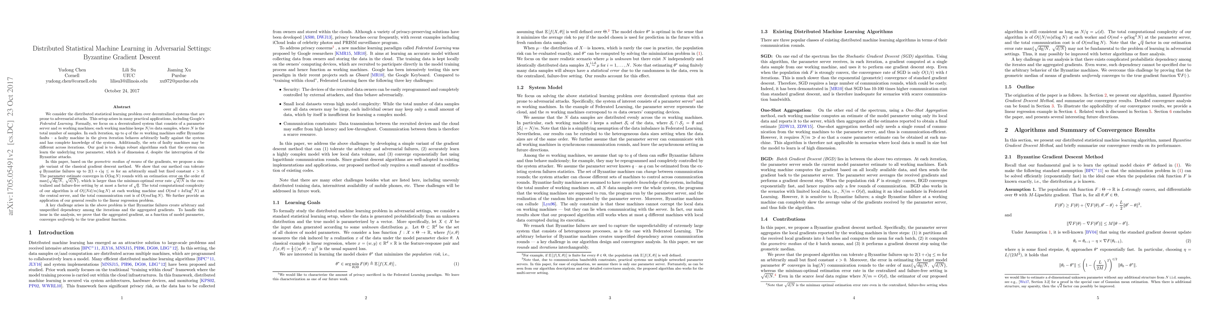 This paper proposes a Byzantine gradient descent method for distributed statistical machine learning in adversarial settings, where some machines may be compromised. The method uses the geometric median to aggregate gradients, which can tolerate up to $(m-1)/2$ Byzantine failures and converges with an error rate approaching the optimal centralized error rate.