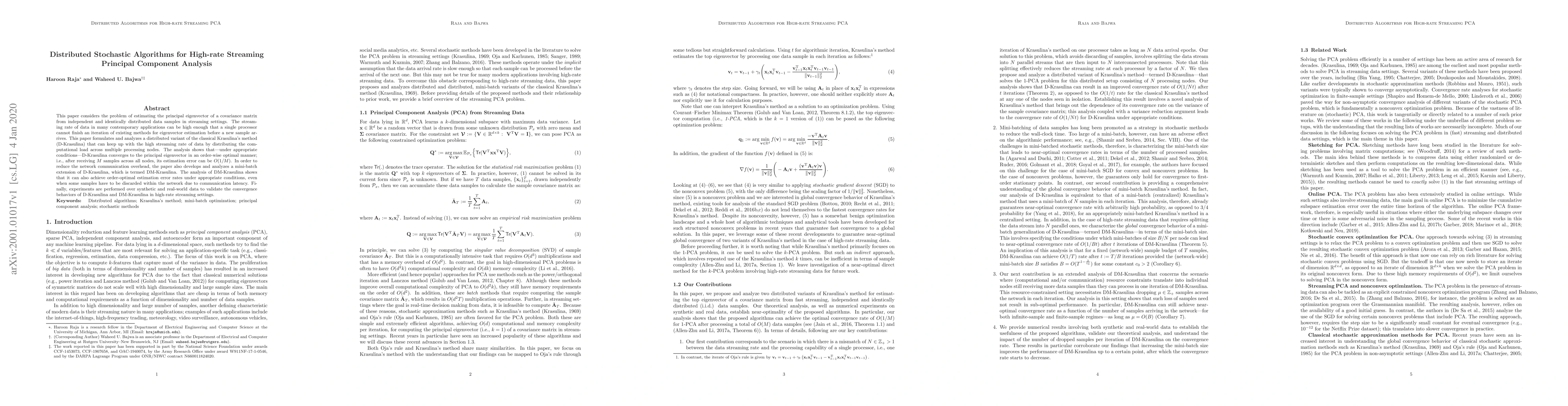 This paper proposes distributed stochastic algorithms, D-Krasulina and DM-Krasulina, for estimating the principal eigenvector of a covariance matrix in high-rate streaming settings. The algorithms distribute computational load across multiple nodes and achieve order-optimal convergence rates despite high data arrival rates and network communication constraints.