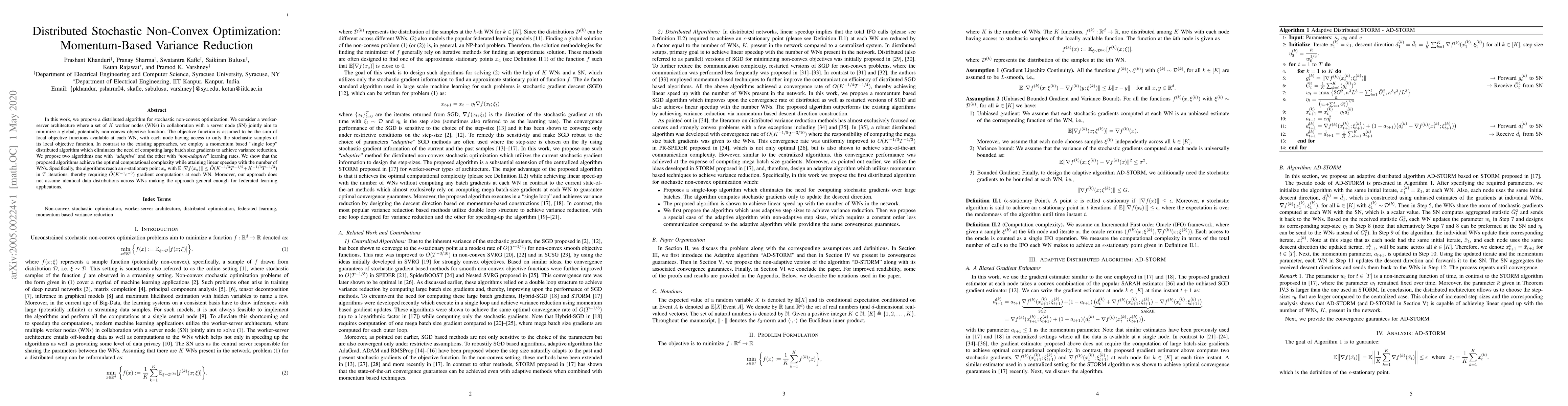 In this work, we propose a distributed algorithm for stochastic non-convex optimization. We consider a worker-server architecture where a set of $K$ worker nodes (WNs) in collaboration with a server node (SN) jointly aim to minimize a global, potentially non-convex objective function. The objective function is assumed to be the sum of local objective functions available at each WN, with each node having access to only the stochastic samples of its local objective function. In contrast to the existing approaches, we employ a momentum based "single loop" distributed algorithm which eliminates the need of computing large batch size gradients to achieve variance reduction. We propose two algorithms one with "adaptive" and the other with "non-adaptive" learning rates. We show that the proposed algorithms achieve the optimal computational complexity while attaining linear speedup with the number of WNs. Specifically, the algorithms reach an $\epsilon$-stationary point $x_a$ with $\mathbb{E}\| \nabla f(x_a) \| \leq \tilde{O}(K^{-1/3}T^{-1/2} + K^{-1/3}T^{-1/3})$ in $T$ iterations, thereby requiring $\tilde{O}(K^{-1} \epsilon^{-3})$ gradient computations at each WN. Moreover, our approach does not assume identical data distributions across WNs making the approach general enough for federated learning applications.