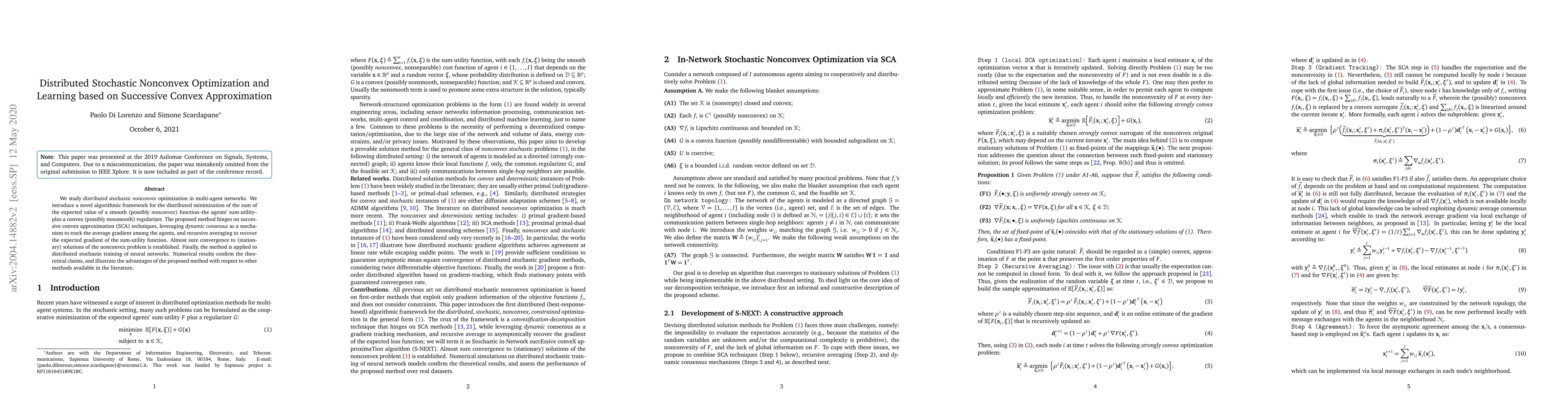 This paper proposes a novel distributed optimization algorithm for multi-agent networks to minimize the sum of a smooth nonconvex function and a convex regularizer using successive convex approximation. The method leverages consensus and averaging to track gradients and converges almost surely to stationary solutions, demonstrating effectiveness in distributed neural network training.